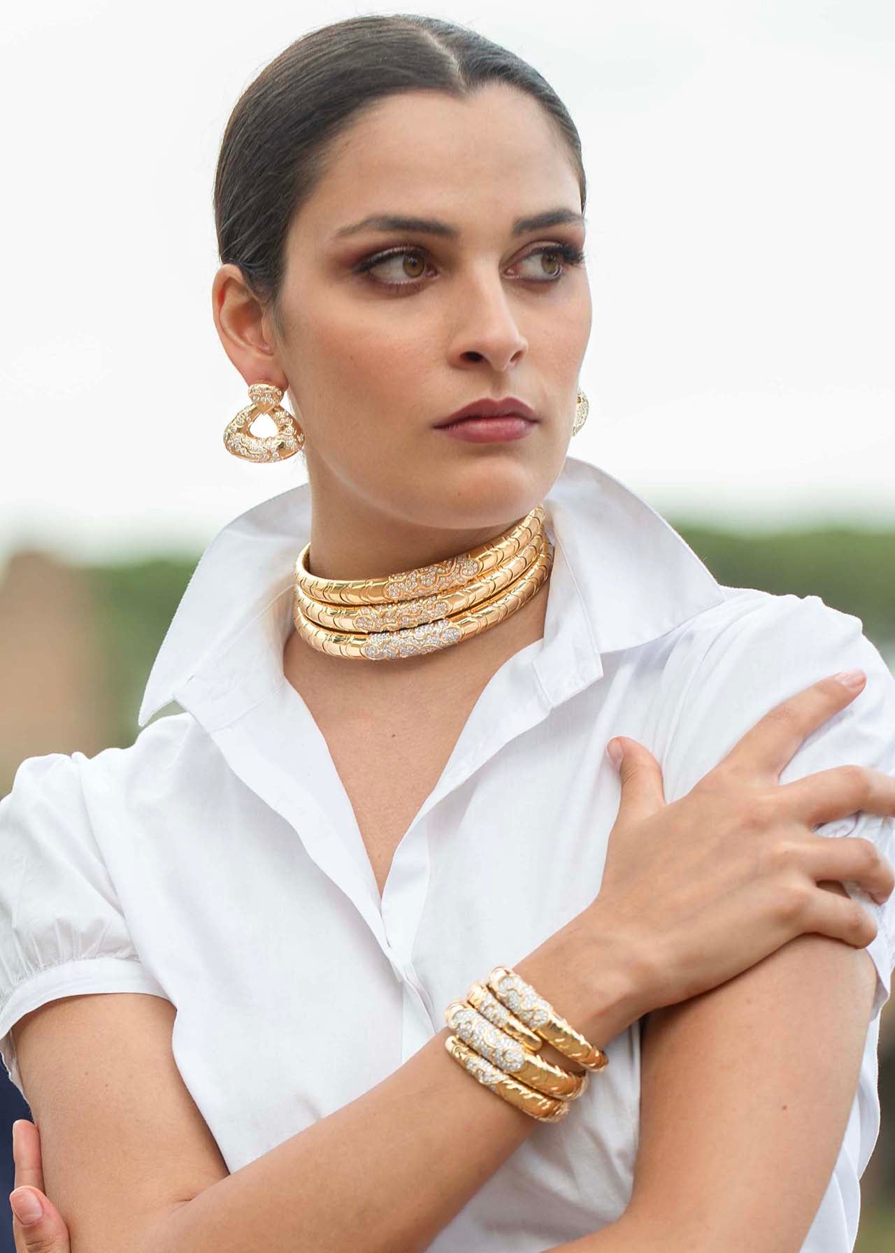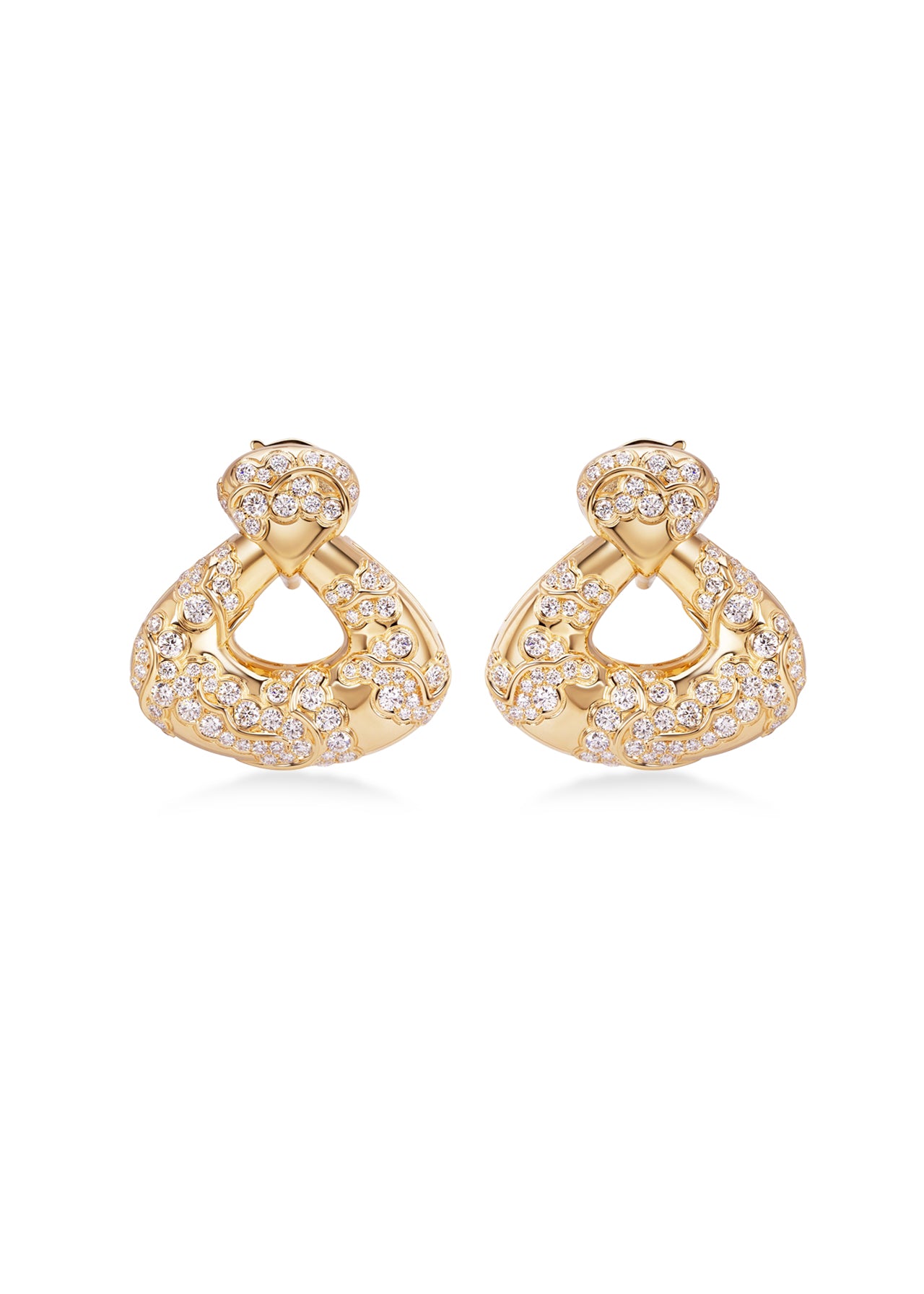 Bold curves and brilliant sparkle define the ANNEC Earrings. Designed in 1985, these 18K yellow gold earrings feature 5.88cts of round diamonds in a sculptural silhouette that captures light beautifully.