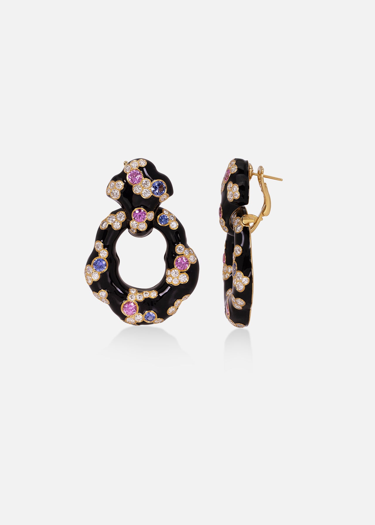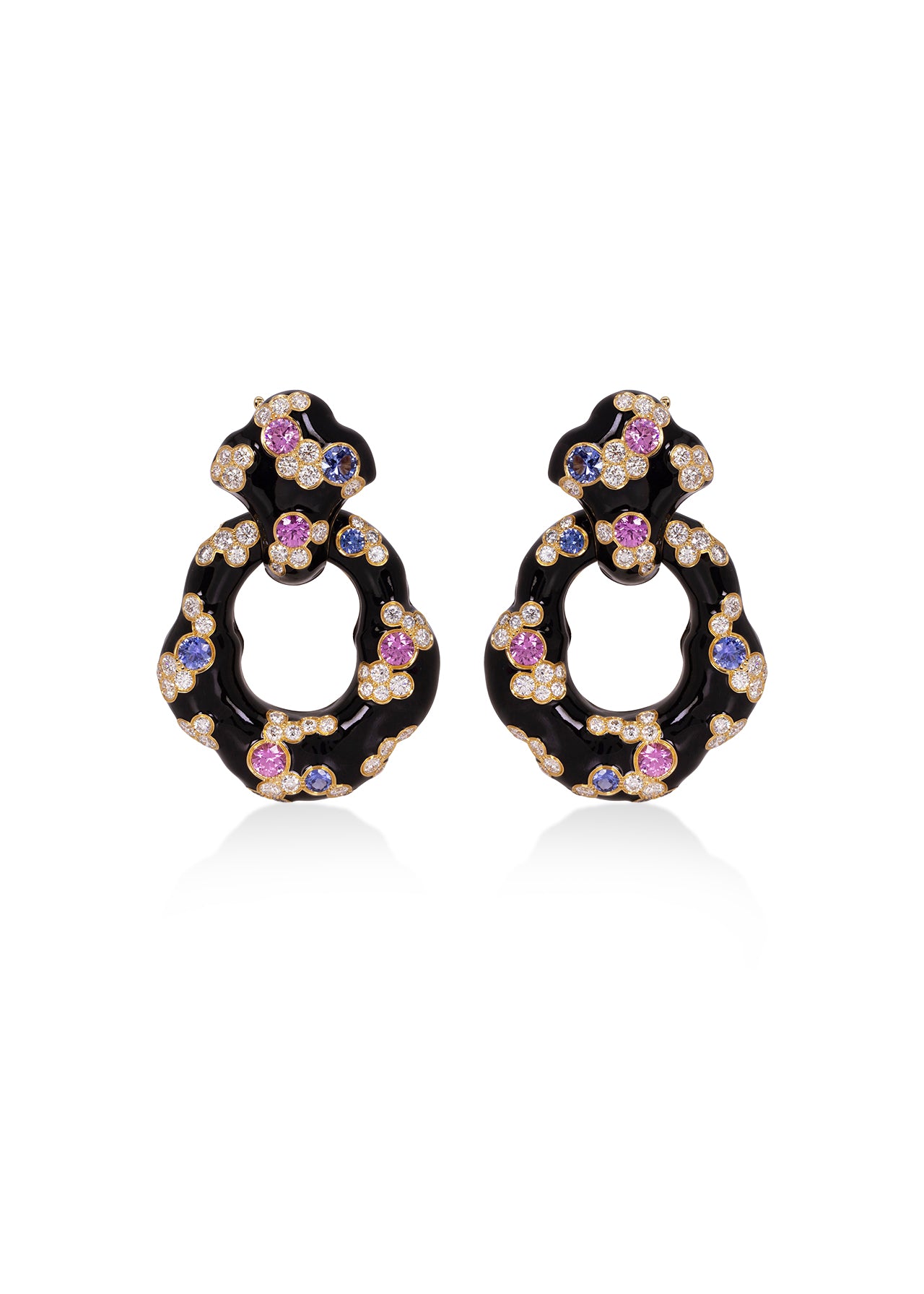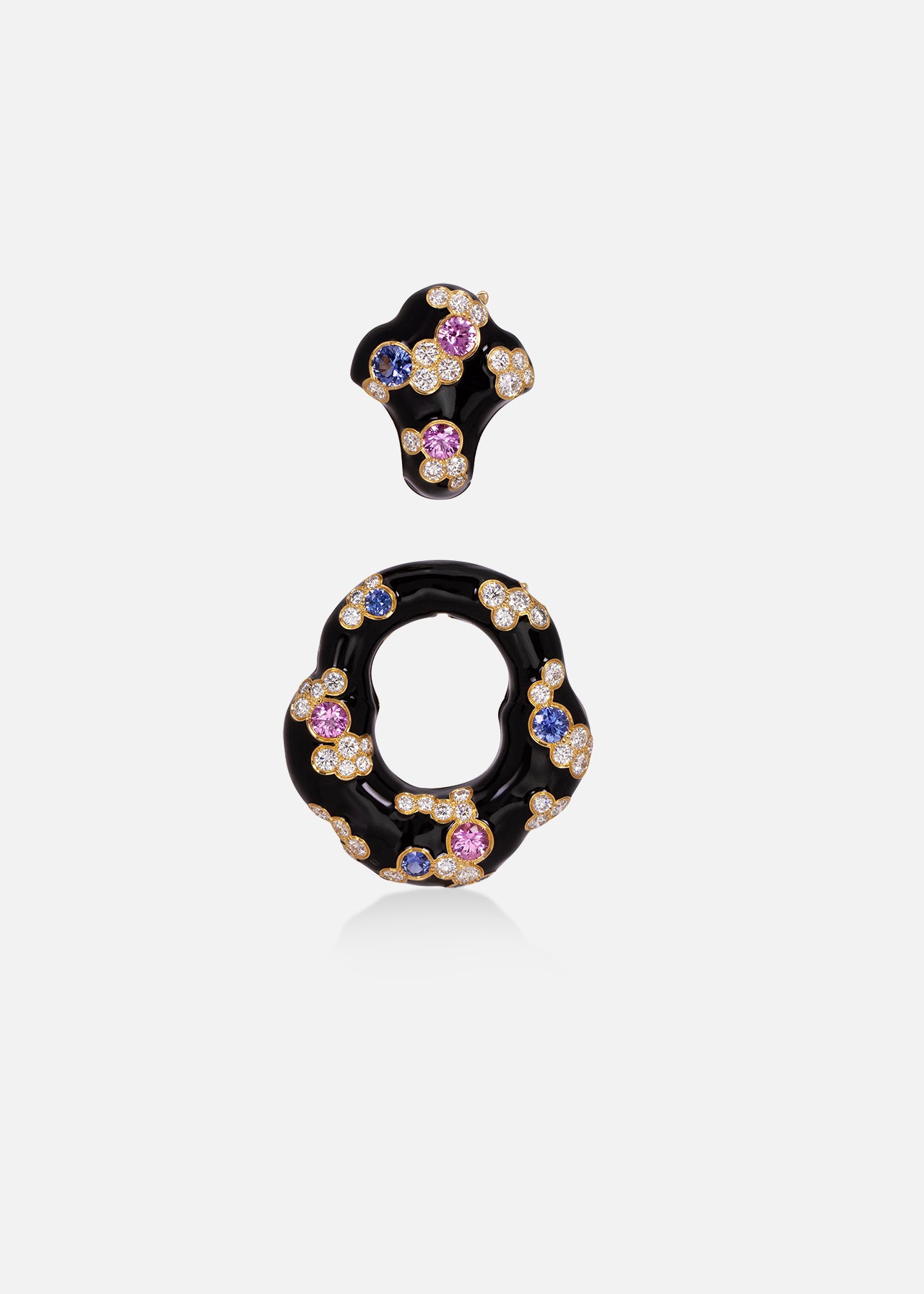 A whimsical burst of color and sparkle, the Fujiyama Earrings dance with contrast—vivid pink and blue sapphires set in glossy black enamel, dotted with brilliant diamonds. A sculptural composition that's playful yet refined.