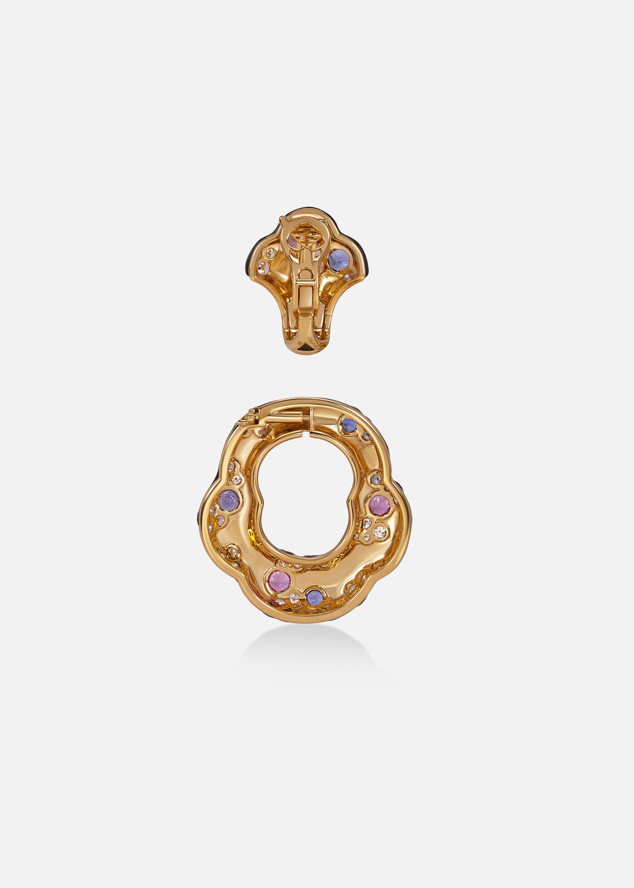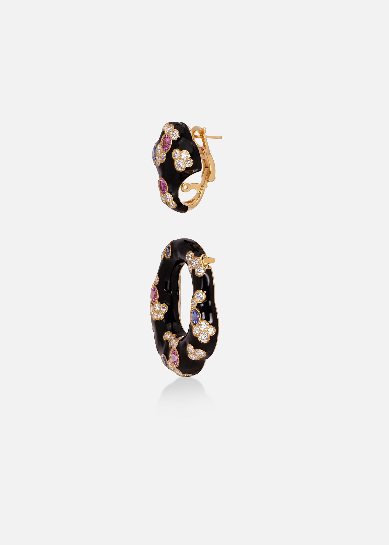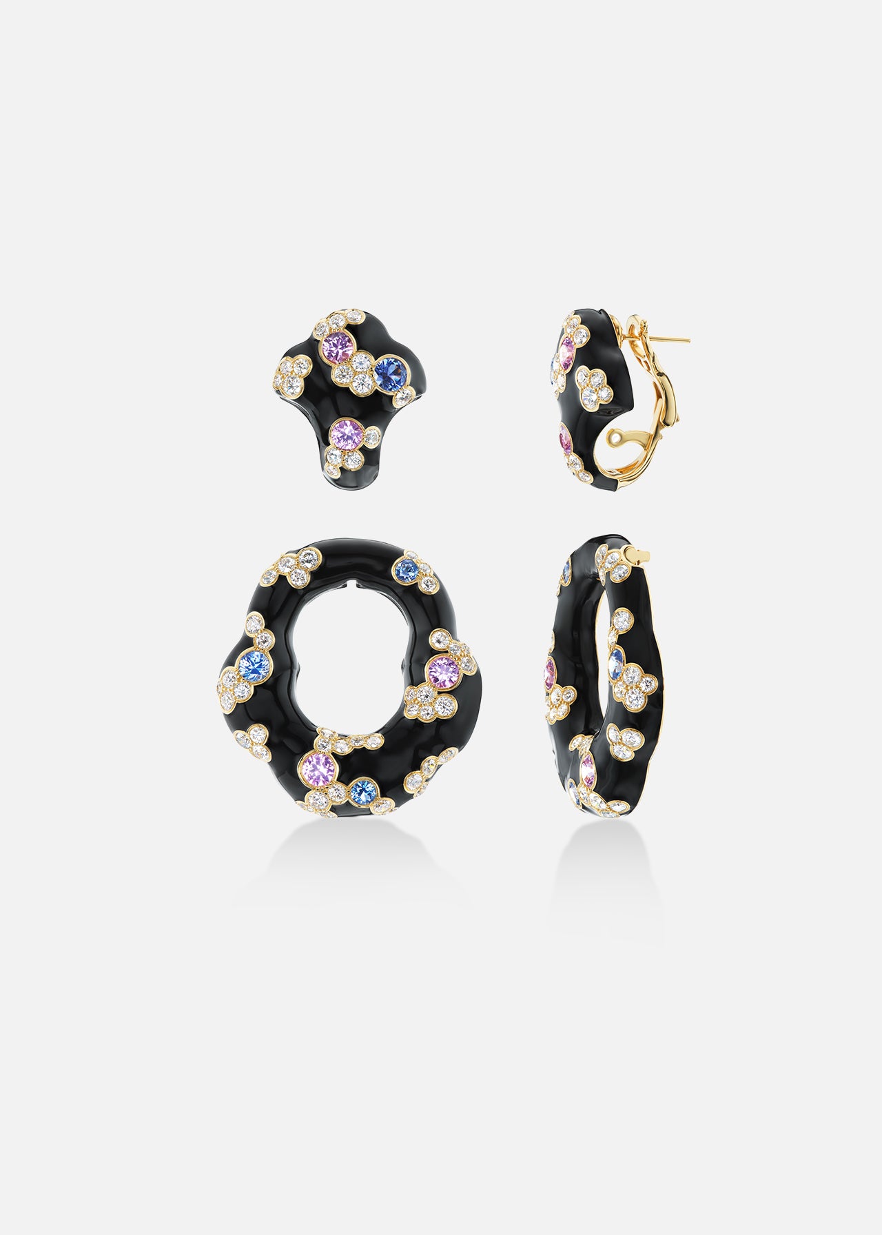 A whimsical burst of color and sparkle, the Fujiyama Earrings dance with contrast—vivid pink and blue sapphires set in glossy black enamel, dotted with brilliant diamonds. A sculptural composition that's playful yet refined.