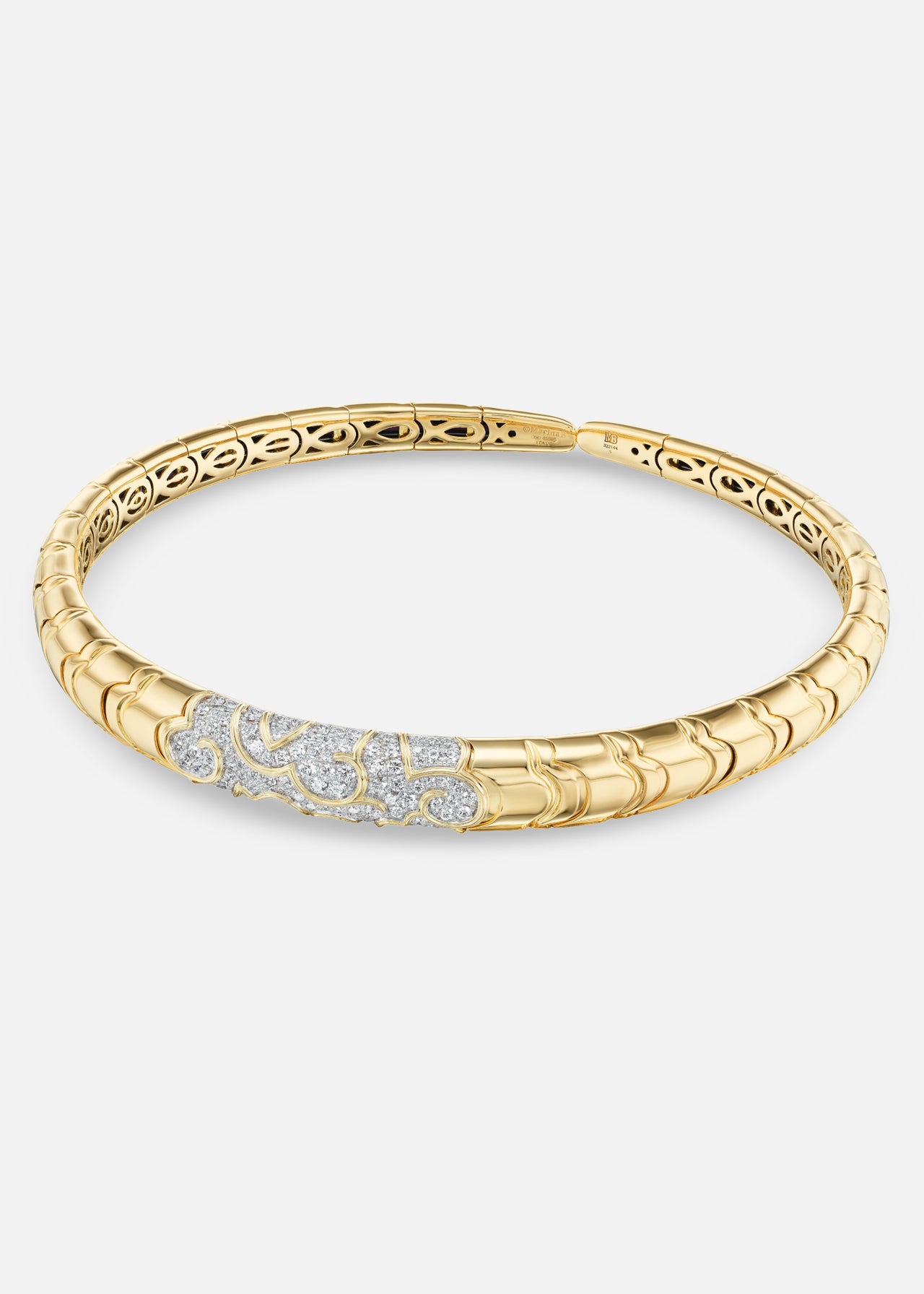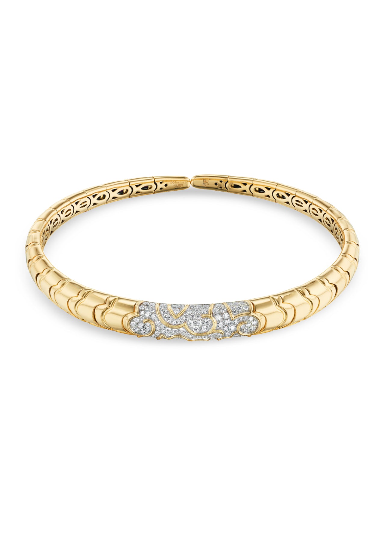 Inspired by the movement of water, the Onda Pavé Collar is a refined statement. Sculpted in 18K yellow gold and pavé diamonds, it curves gracefully around the neckline.