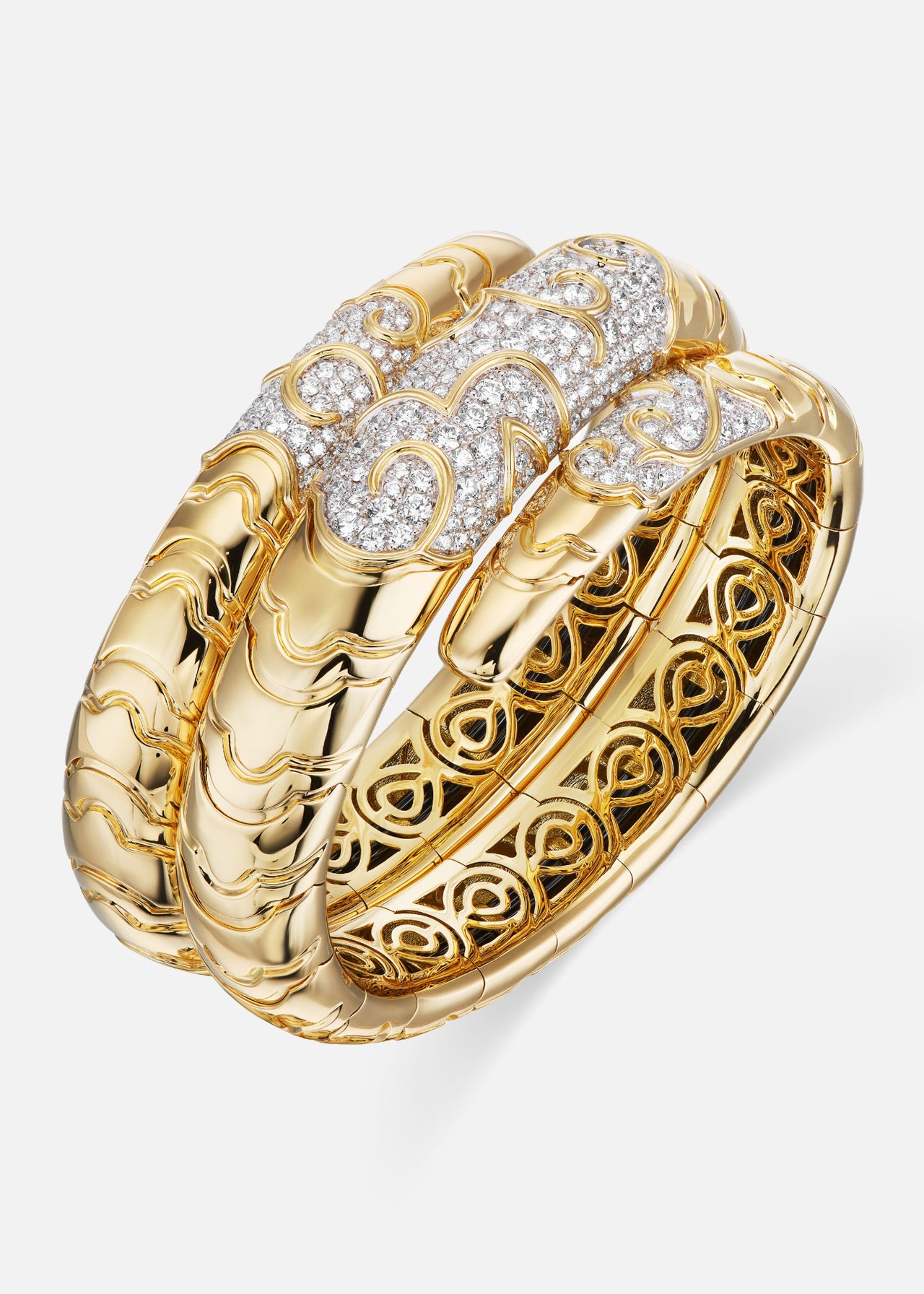 Three interwoven bands flow in perfect harmony on the Onda Triple Bangle. Crafted in 18K yellow gold and pavé diamonds, this sculptural piece captures the rhythm of the sea.