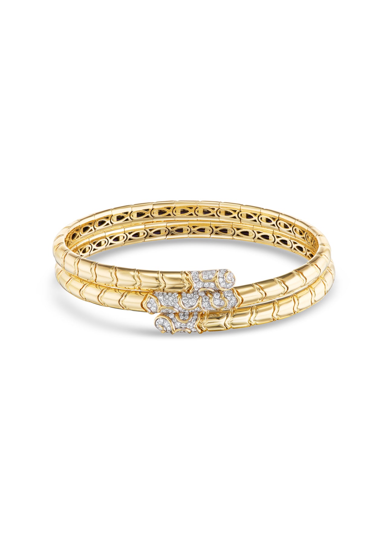 The Ondine Triple Bangle brings sculptural rhythm to the wrist with three fluid rows of 18K yellow gold, accented by a central burst of pavé diamonds for subtle brilliance.