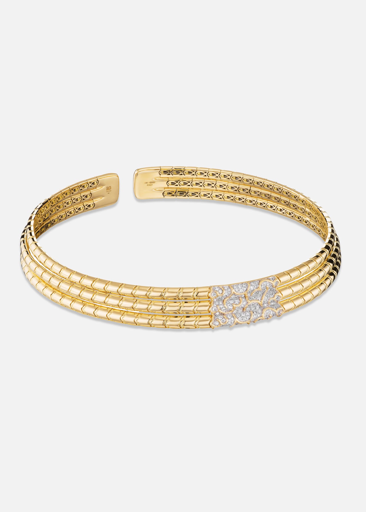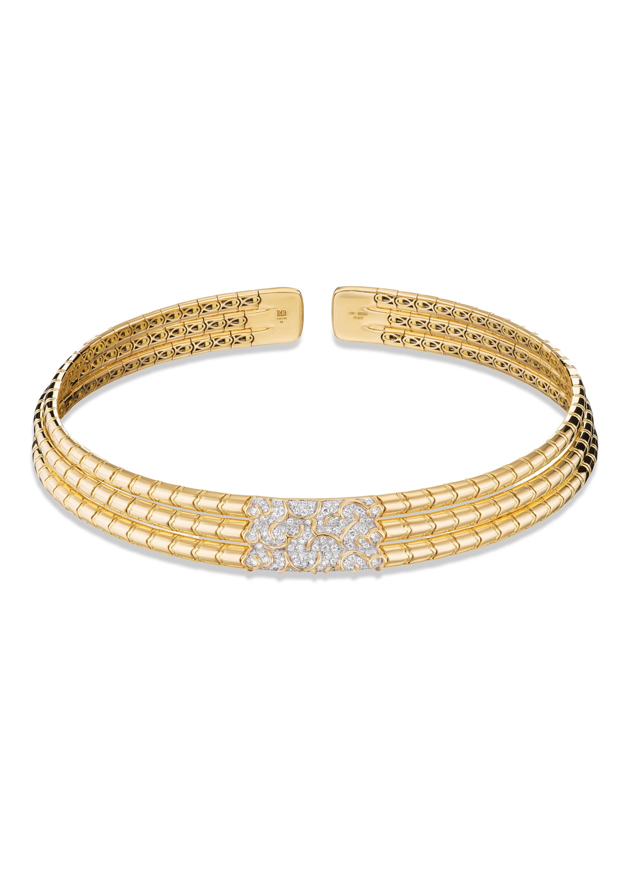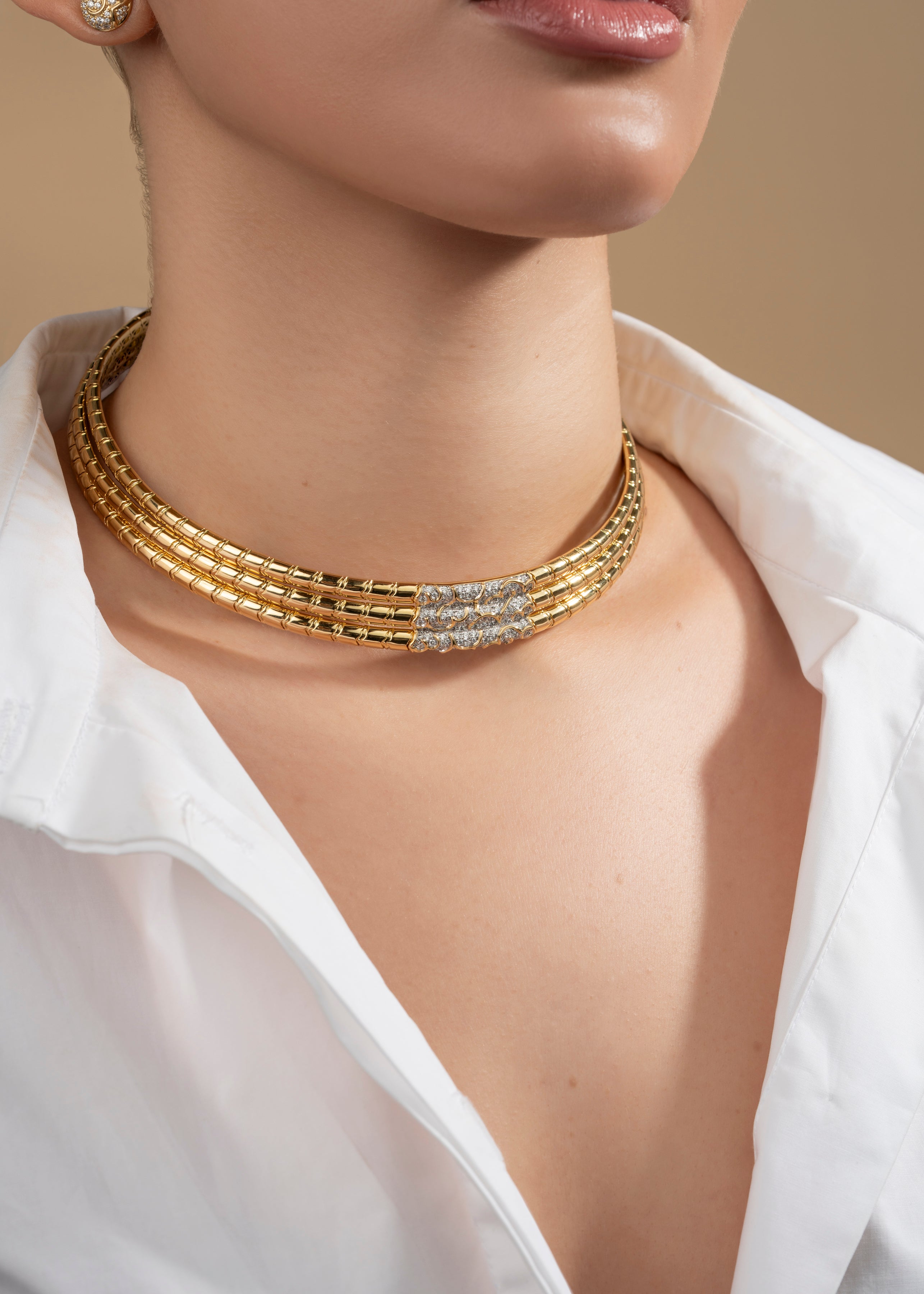 The Ondine Triple Row Collar features three sculpted bands of 18K yellow gold, united by a luminous panel of pavé diamonds. A bold yet refined expression of modern elegance.