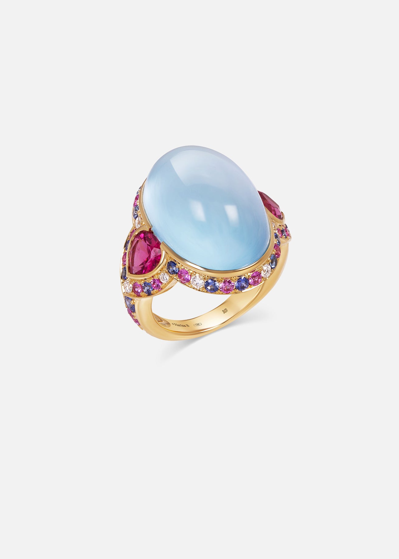 A celebration of bold color and refined design. This striking Pacila ring features a luminous 30.69ct sky blue topaz cabochon, flanked by a pear-shaped rubellite and pavé-set sapphires and diamonds in vivid hues—all set in 18K yellow gold.