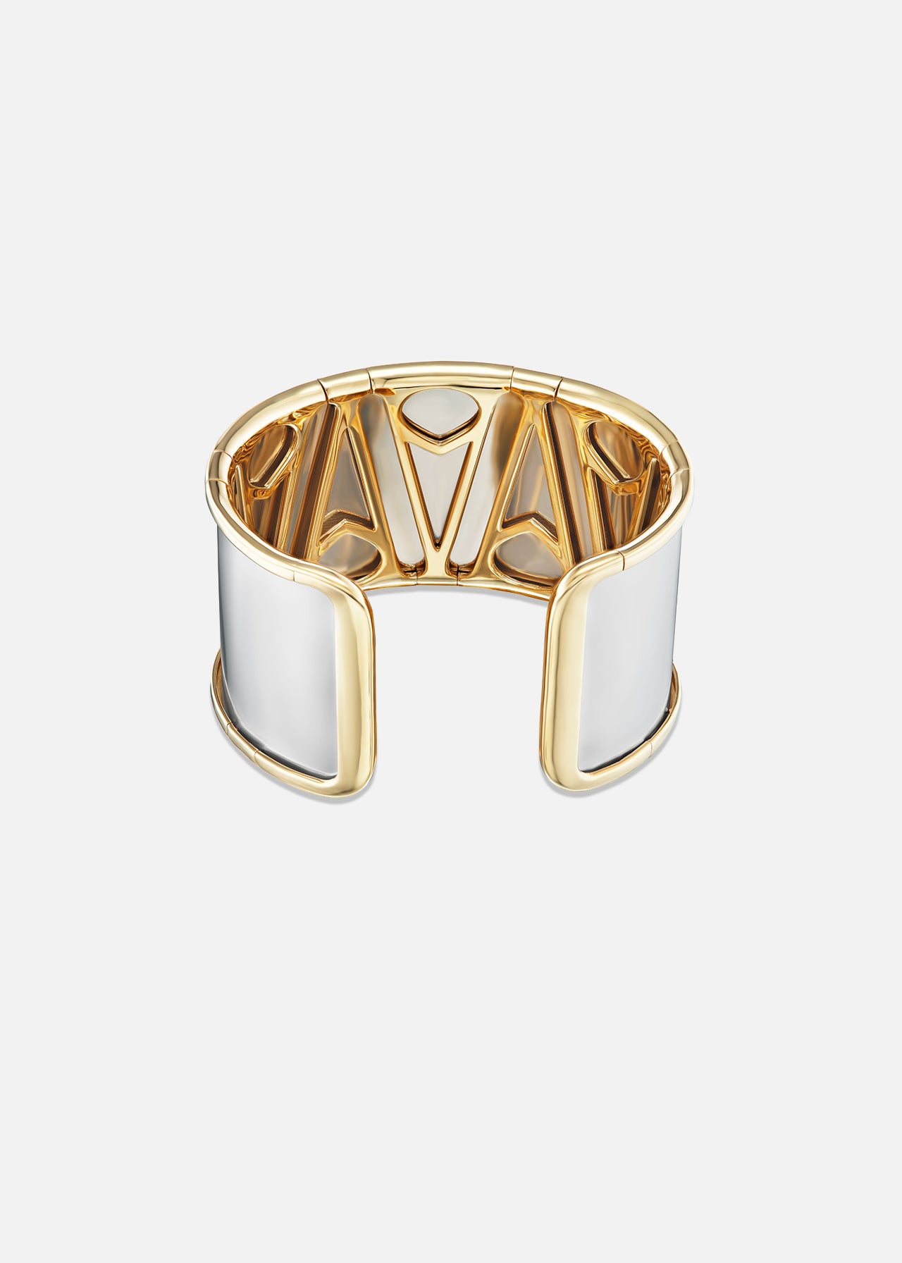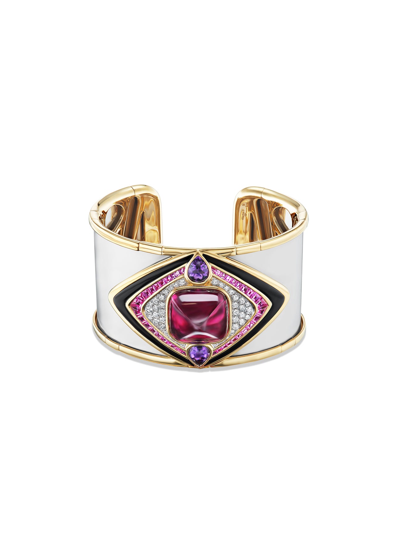 Bold geometry meets vibrant elegance in the Sabina Cuff. A luminous cabochon rubellite anchors the design, accented by onyx inlays, pear-shaped amethysts, buff-top pink sapphires, and shimmering pavé diamonds—crafted in rich 18K yellow gold.
