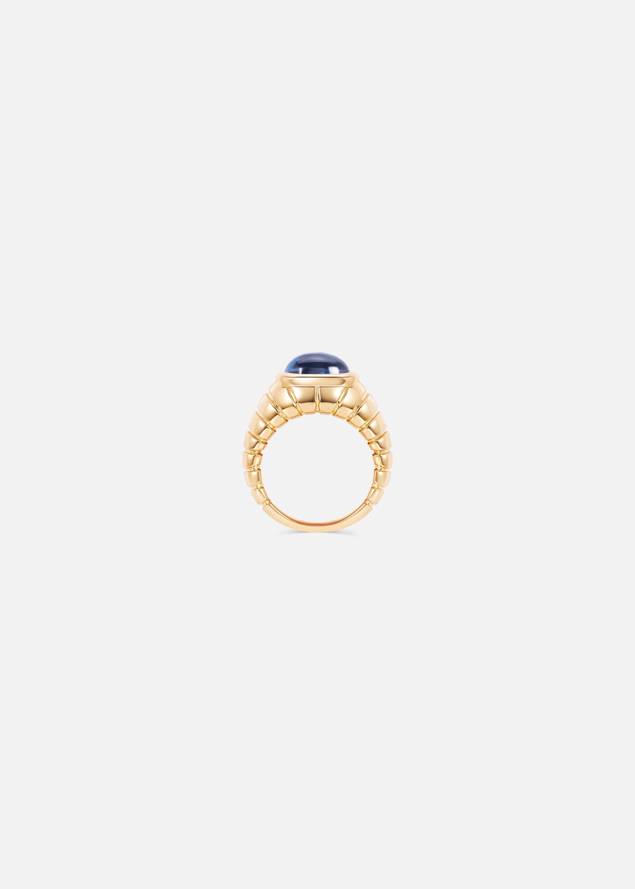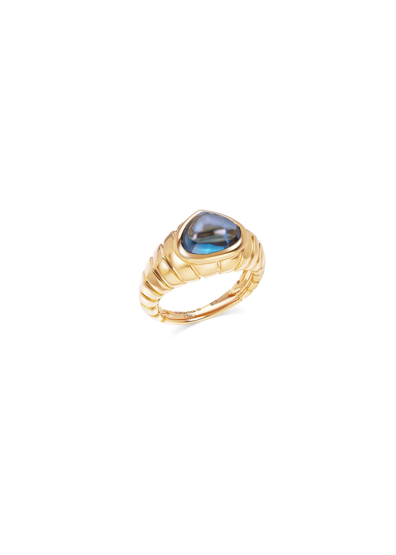 A striking 3.98ct cabochon blue topaz sits at the heart of this sculptural Timo Ring. Set in polished 18K yellow gold, this design from the Trisolina collection radiates vibrant color and smooth, modern refinement.