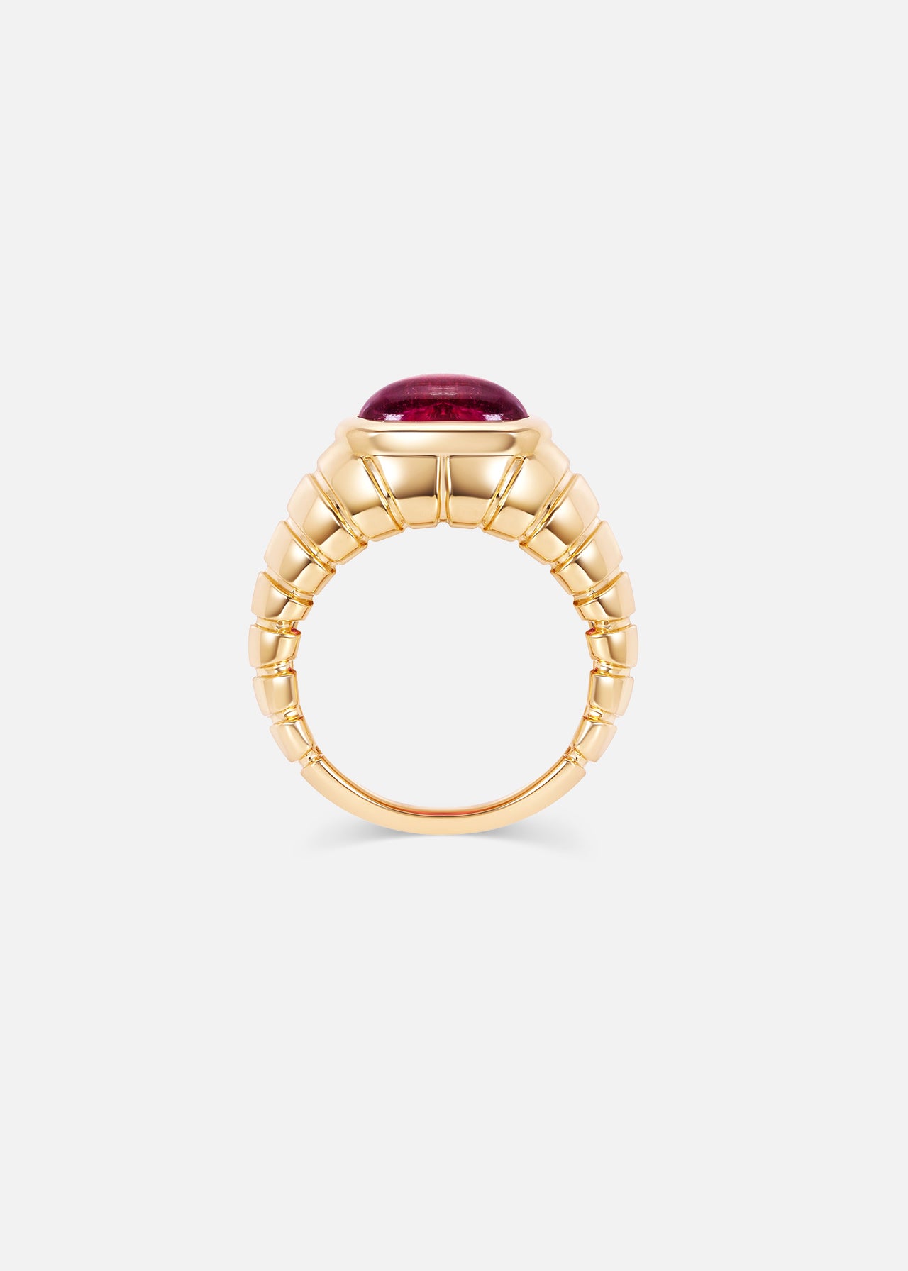 A rich 3.24ct rubellite cabochon crowns this Timo Ring, its smooth dome set in 18K yellow gold. From the Trisolina collection, this piece blends vibrant color with soft, sculptural elegance in a bold, modern silhouette.