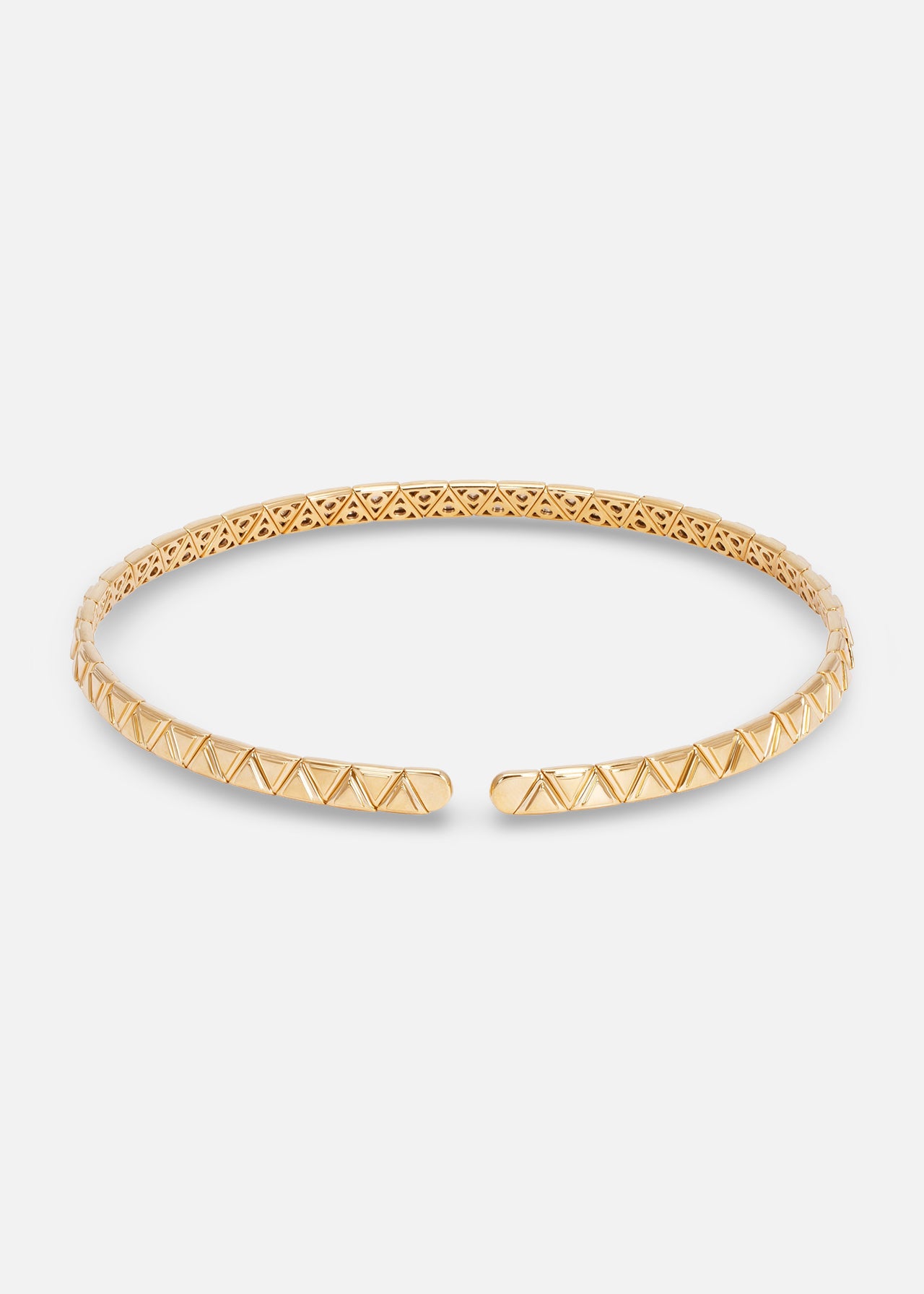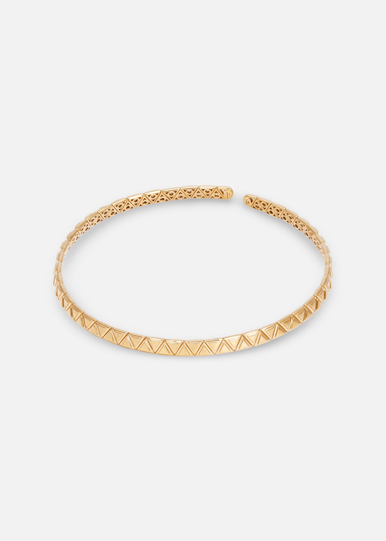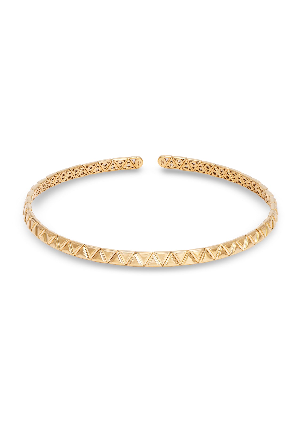 Bold and refined, the Triangolini Gold Collar captures the power of form in a sleek silhouette. Crafted entirely in 18K yellow gold, its sculptural pyramid motif creates visual rhythm and timeless elegance—perfect on its own or layered with other Marina B icons.