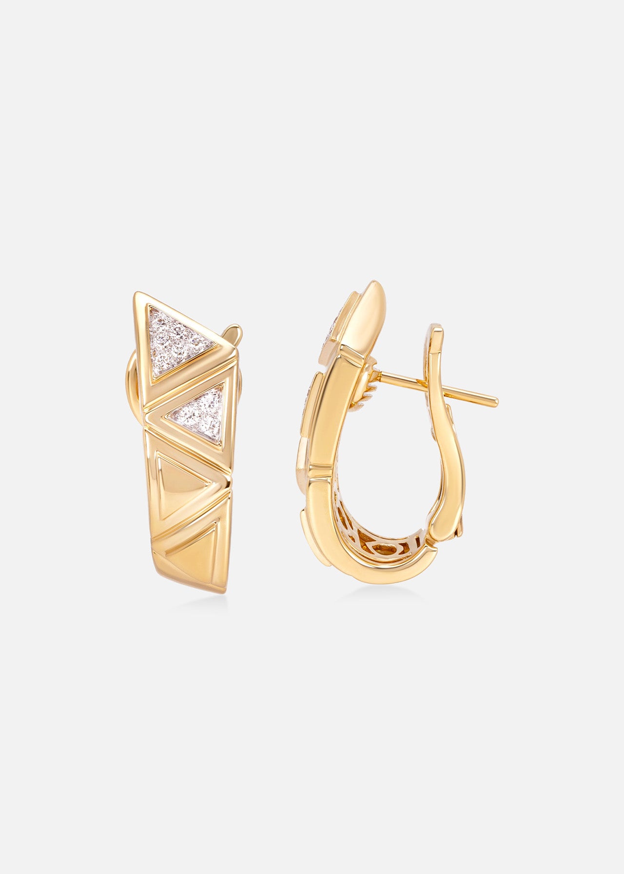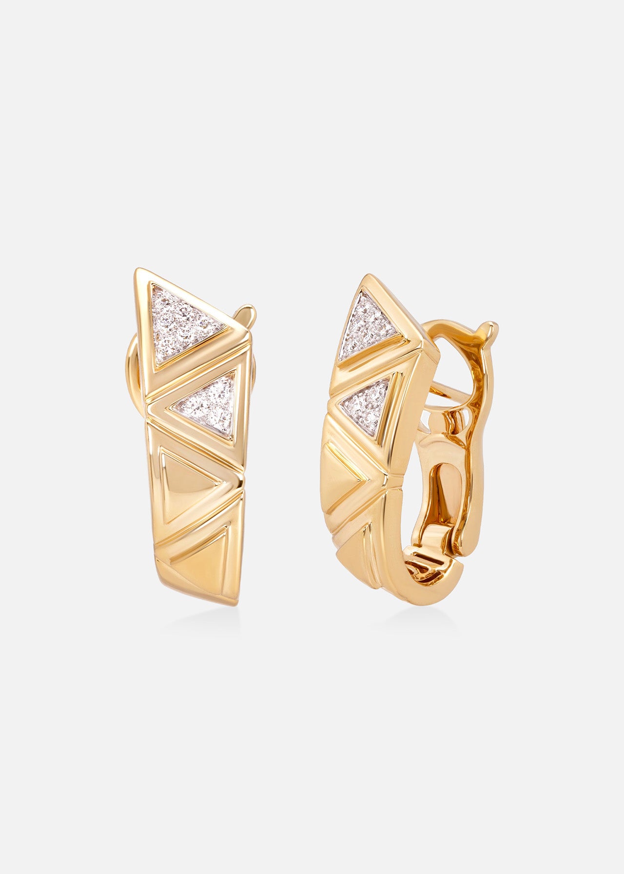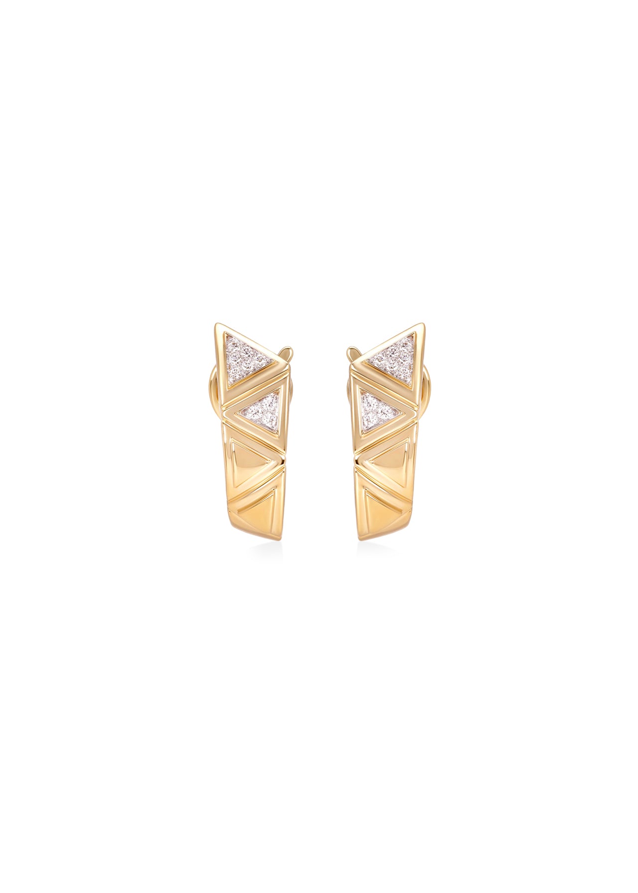Sculptural and bold, these Triangolini earrings in 18K yellow gold dazzle with geometric diamond pavé triangles that play with light and shadow in every movement.