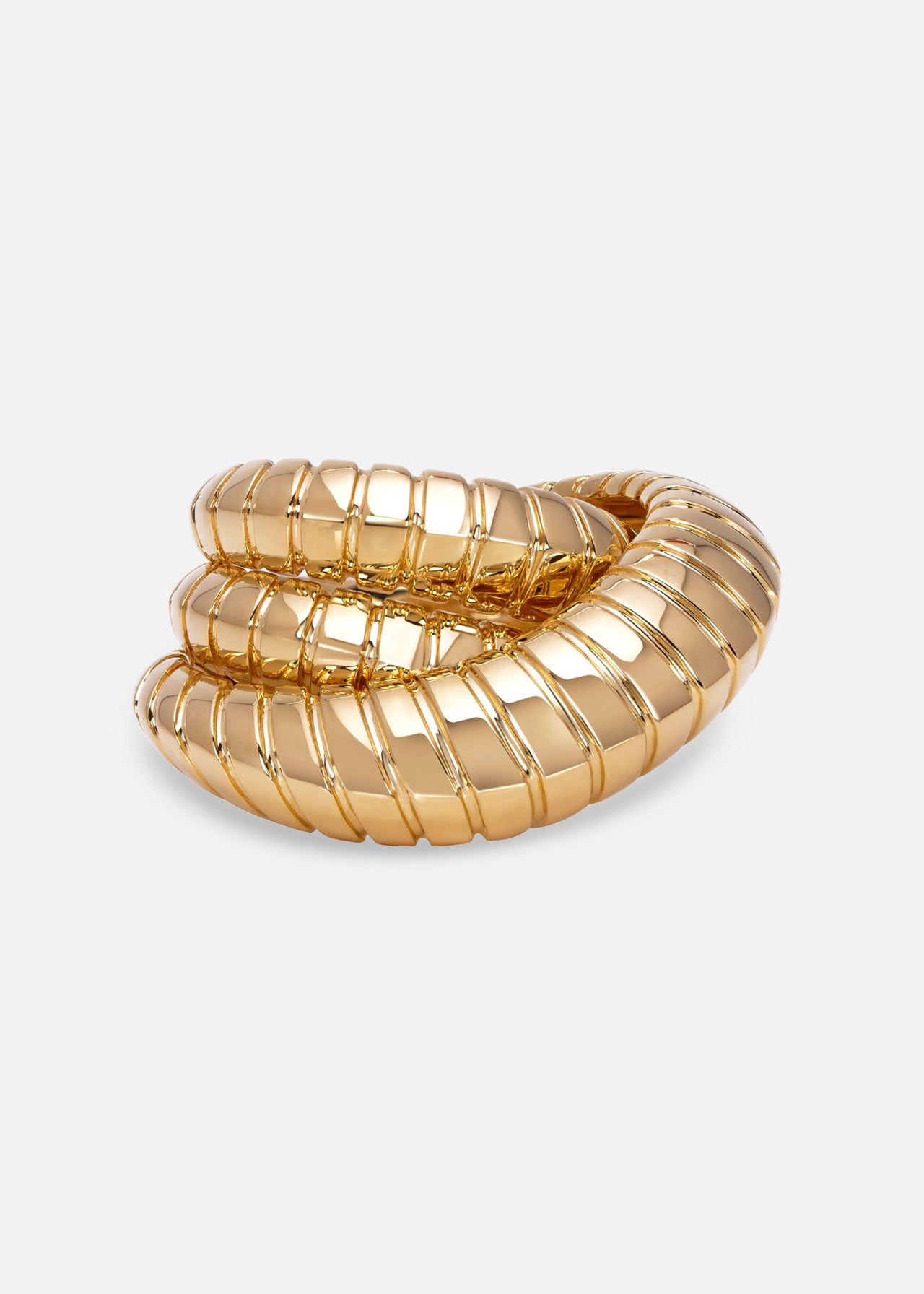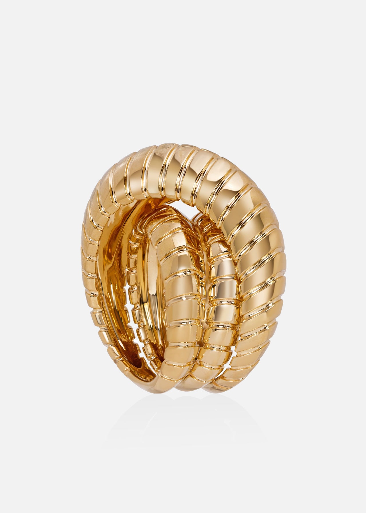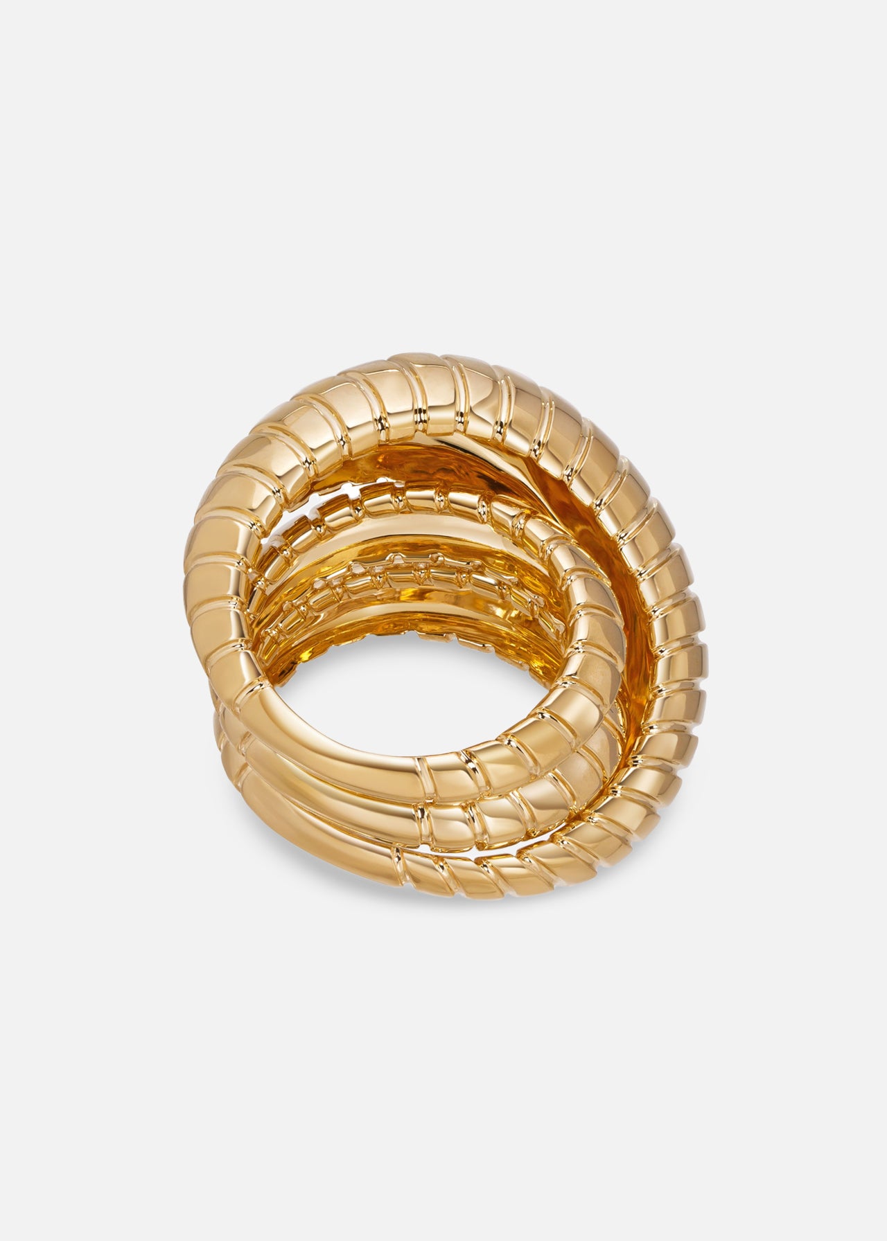 Bold in scale and fluid in form, the Trisola Magnus Ring wraps in luminous 18K yellow gold. Its sculptural presence makes a powerful statement with unmistakable Marina B style.