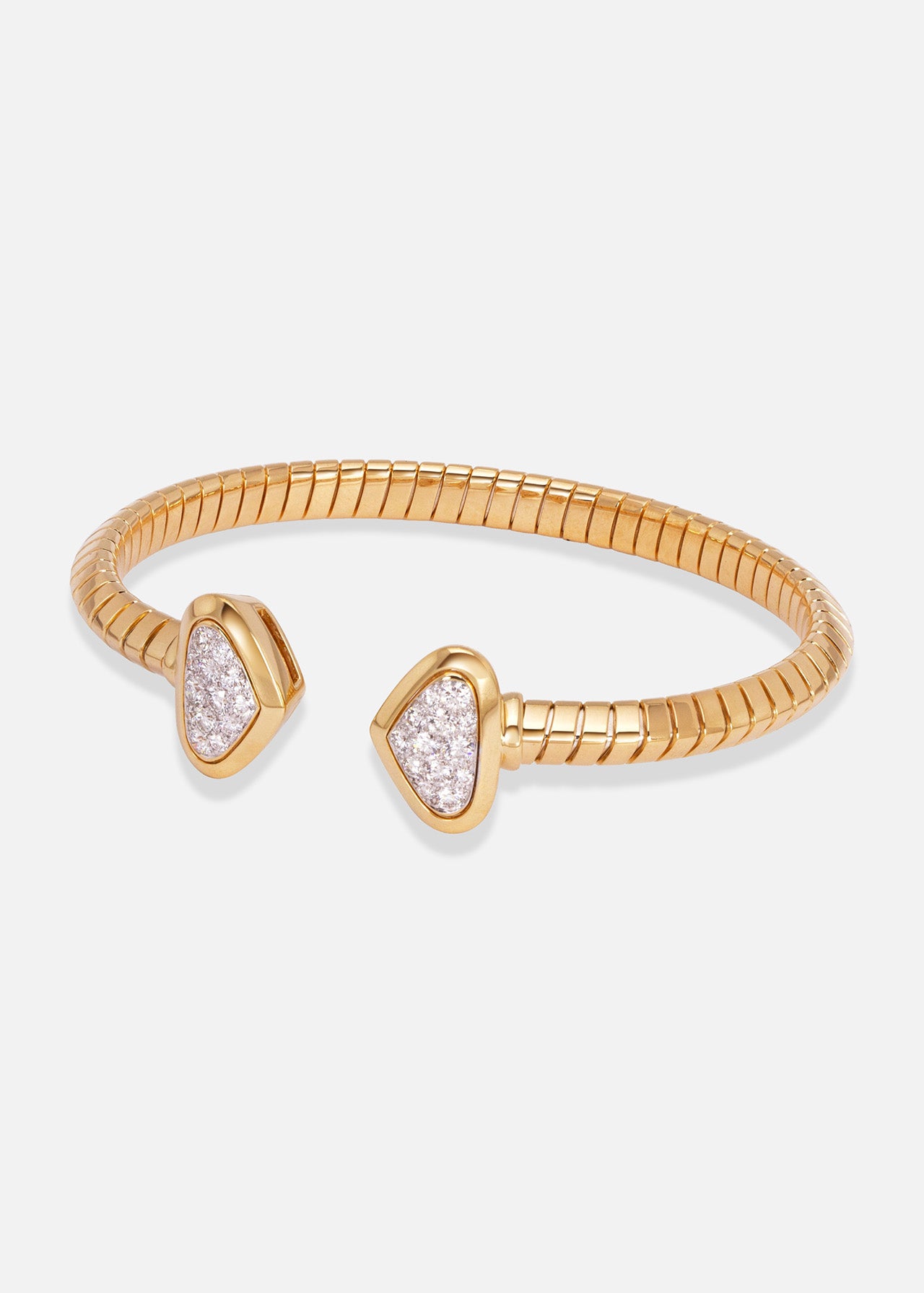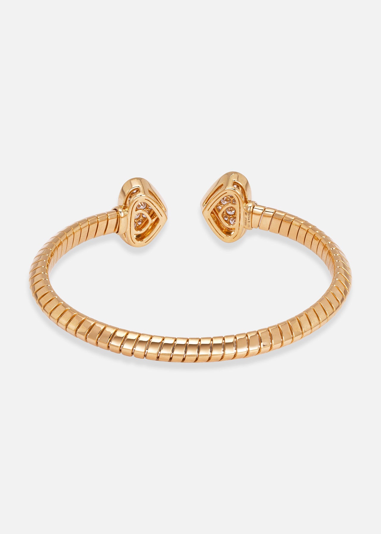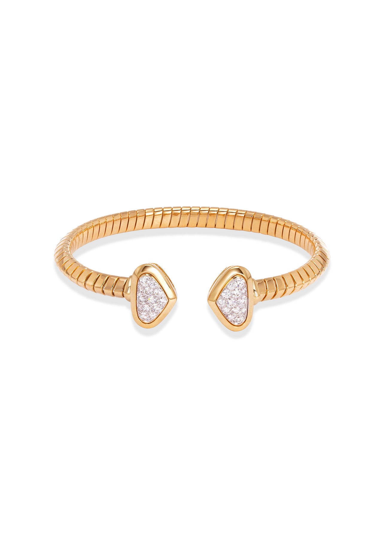 The Trisolina Big Castagna Diamond Pavé Bangle features bold, sculptural end caps adorned with 0.52cts of pavé diamonds. Crafted in 18K yellow gold, it balances everyday elegance with striking edge.