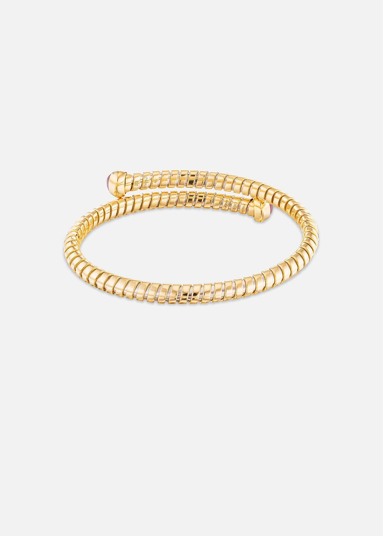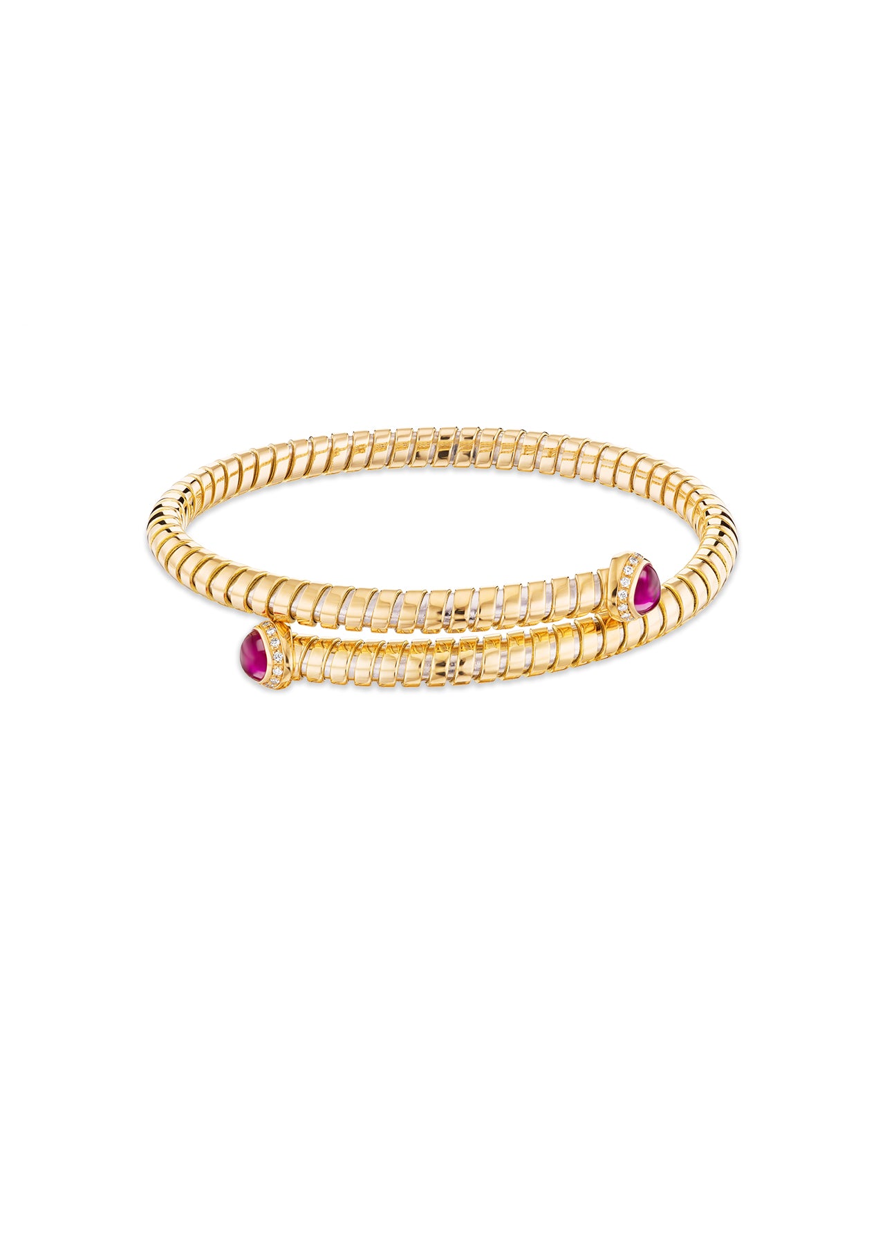 The Trisolina Cabochon Ruby Bangle features twin 1.3ct cabochon rubies and .08 cts of diamonds set in an 18K yellow gold—bold color and sculptural elegance in one striking, stackable piece.
