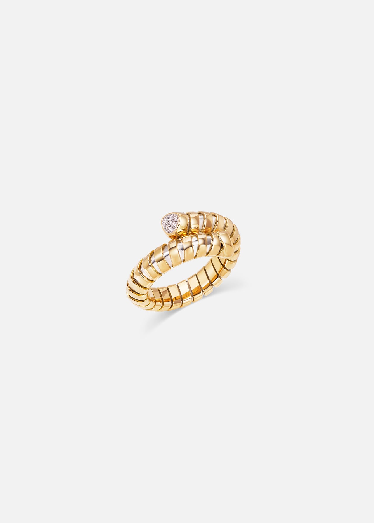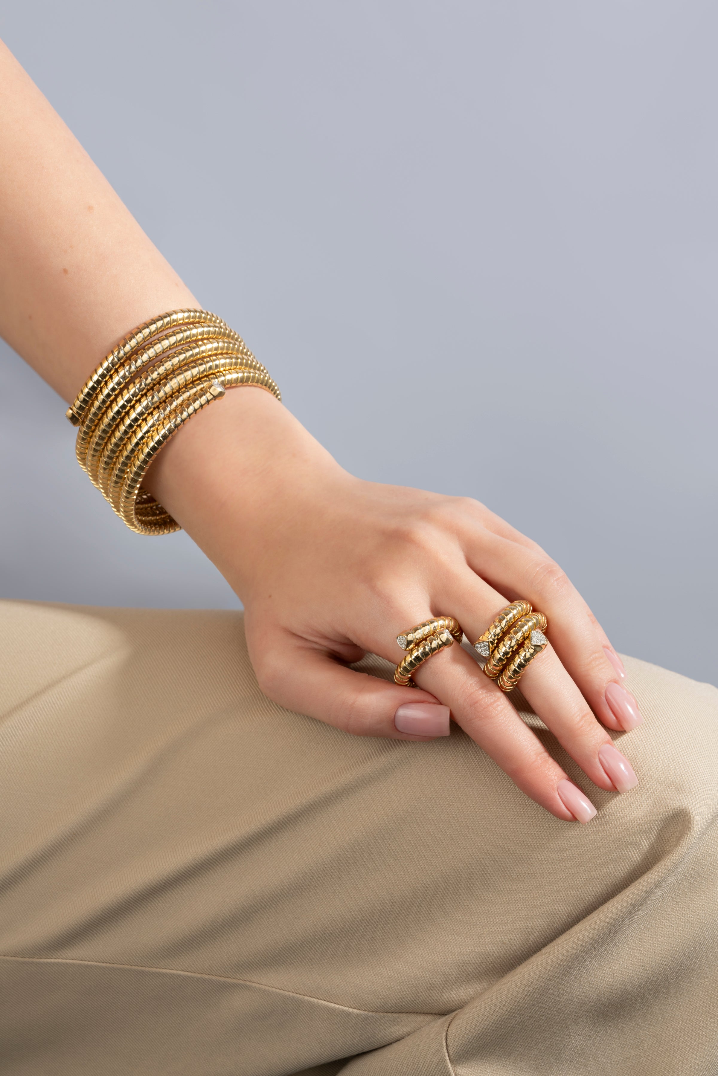 Bold and architectural, the Trisolina Bypass Ring wraps gracefully around the finger, accented with 0.08ct of pavé-set diamonds. Crafted in 18K yellow gold, this flexible design offers signature Marina B sophistication with a dynamic twist.