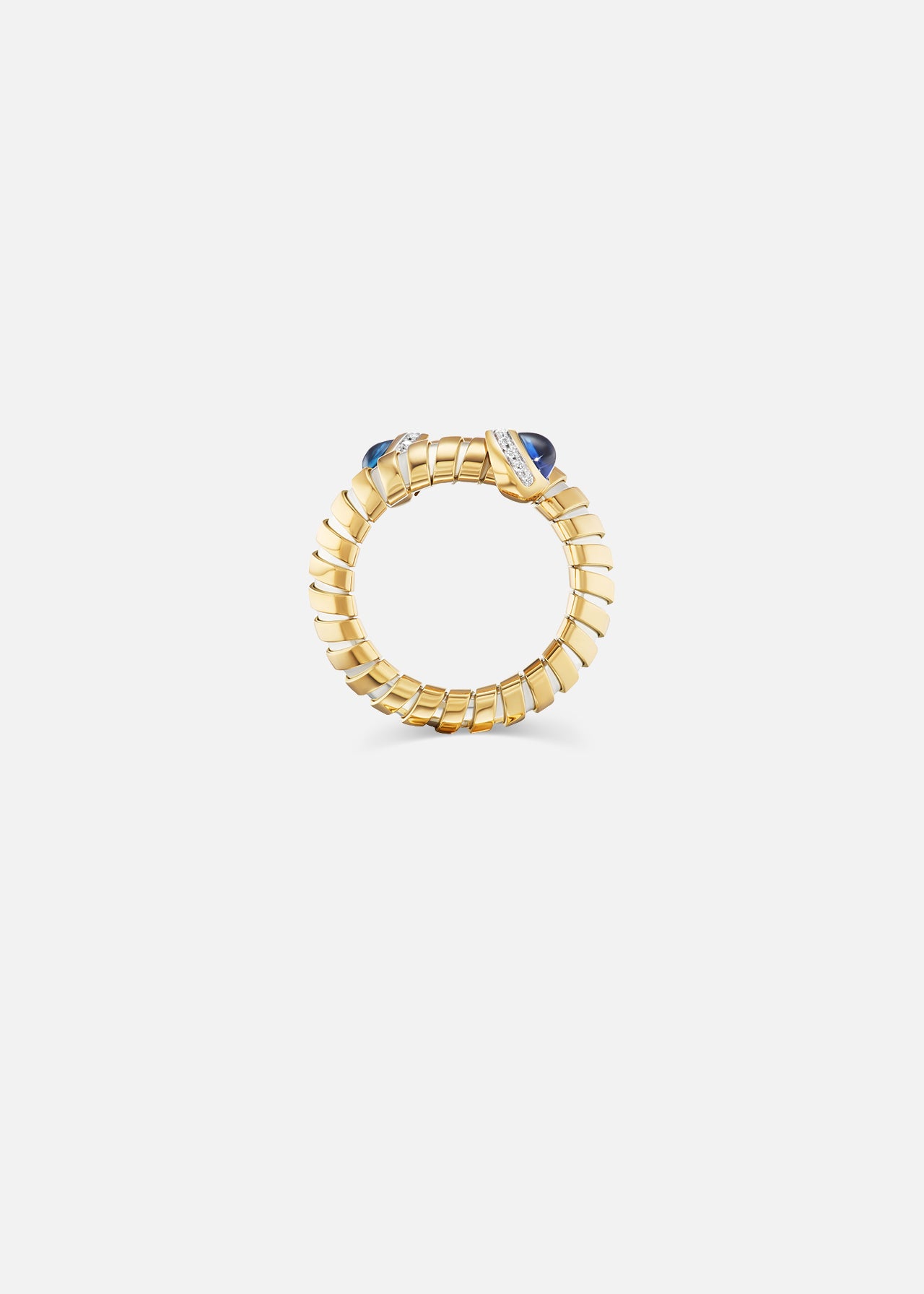 Sculptural elegance meets iconic heritage. The Trisolina Bypass Ring features two cabochon blue sapphires at each end of an 18K yellow gold band, blending bold design with timeless refinement.