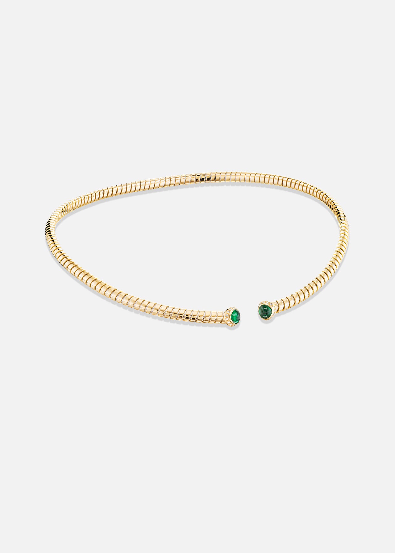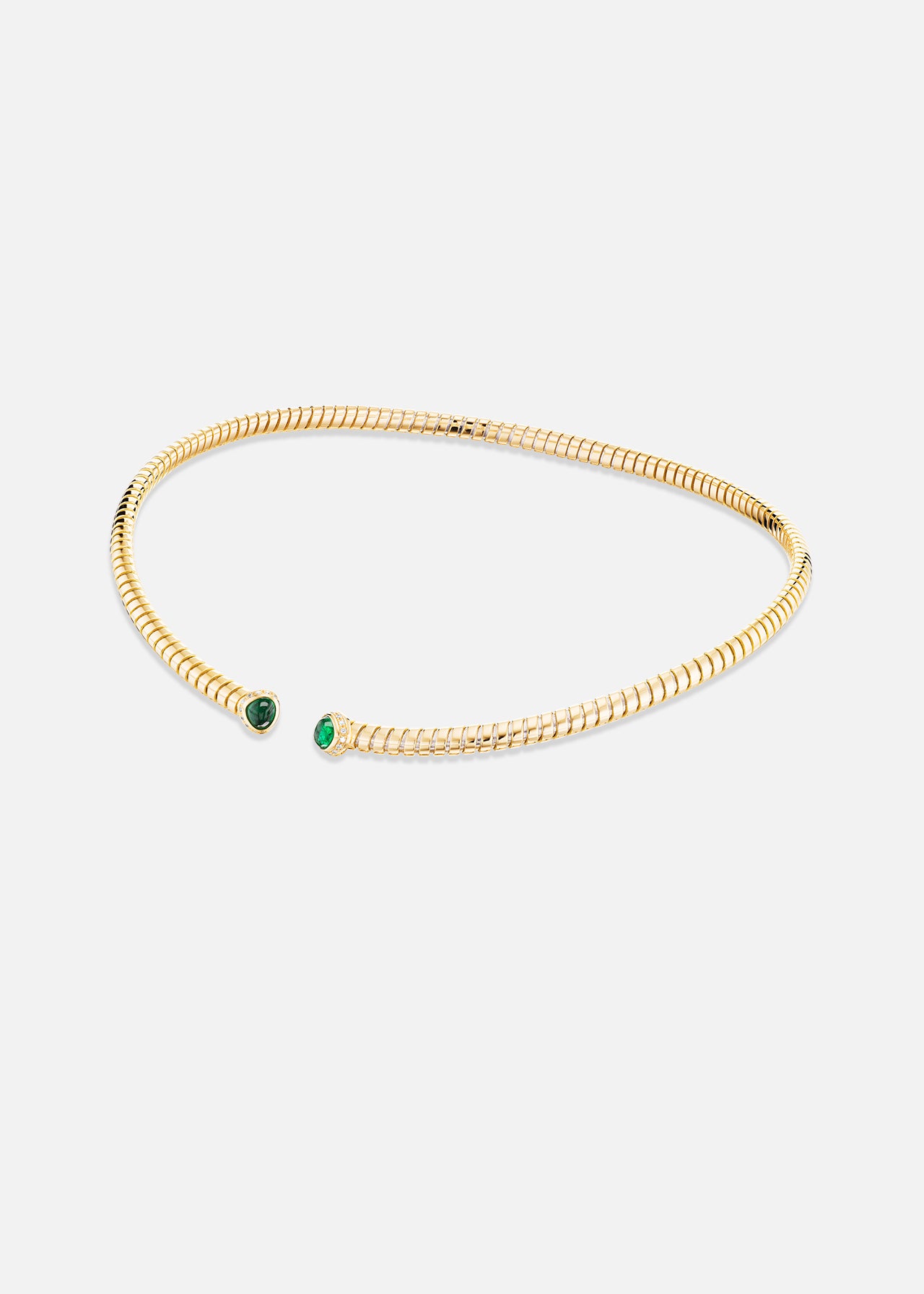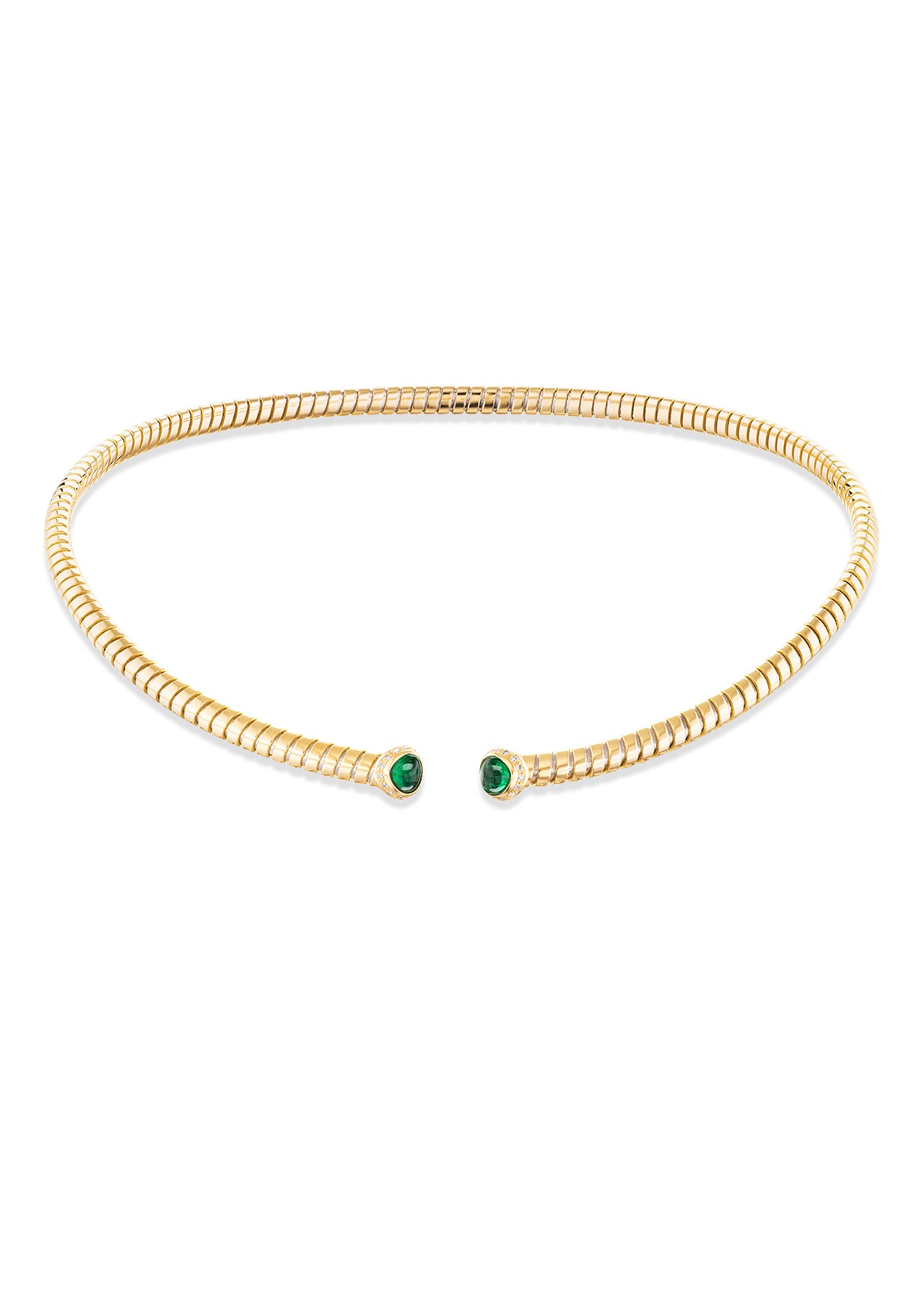 Radiant and refined, the Trisolina Cabochon Emerald Collar features twin emeralds (0.85cts) and 0.09cts of pavé diamonds. Set in 18K yellow gold, it’s a fresh take on timeless luxury.