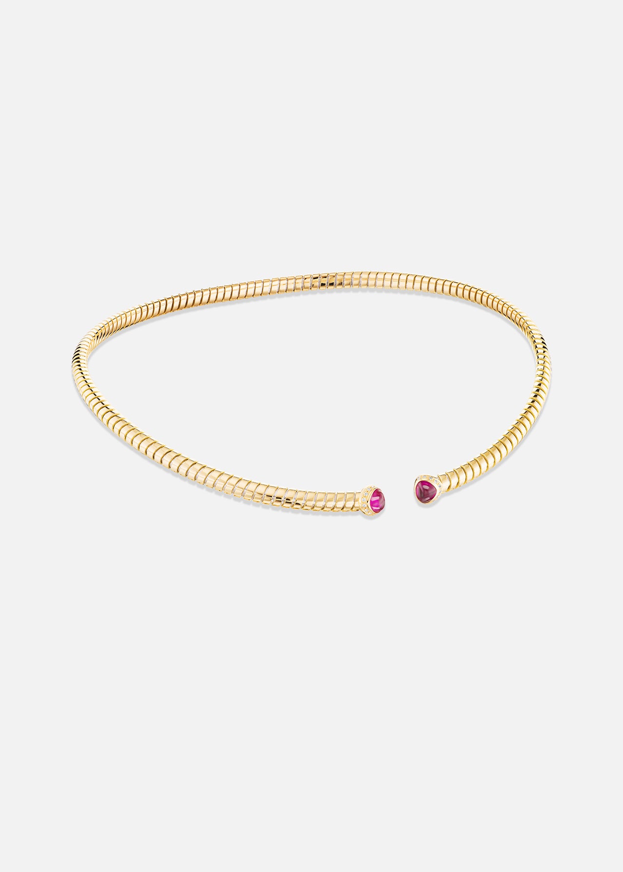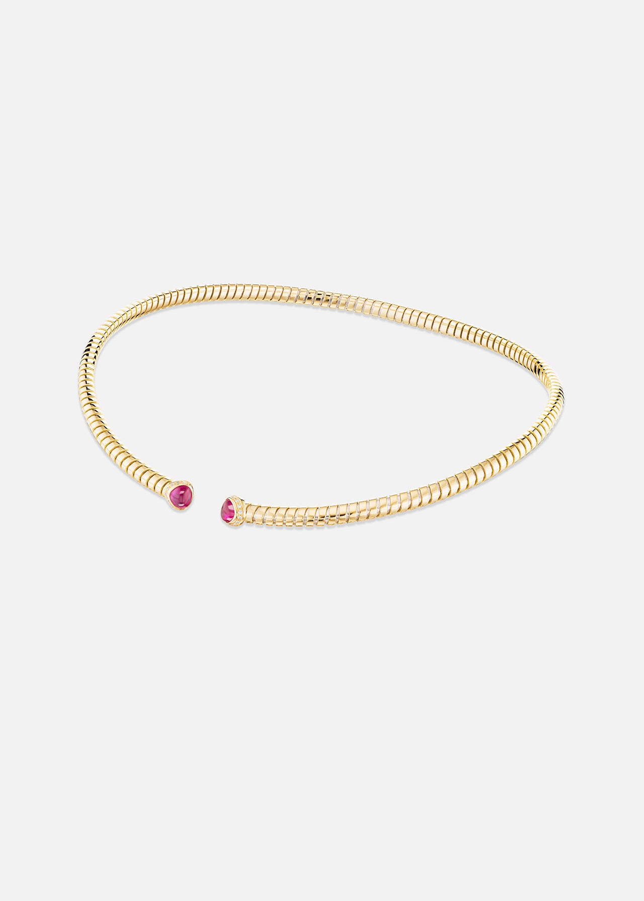 Feminine and refined, the Trisolina Cabochon Rubies Collar features two vivid rubies (1.3cts) and 0.09cts of pavé diamonds set in 18K yellow gold. Elegant color meets everyday luxury.