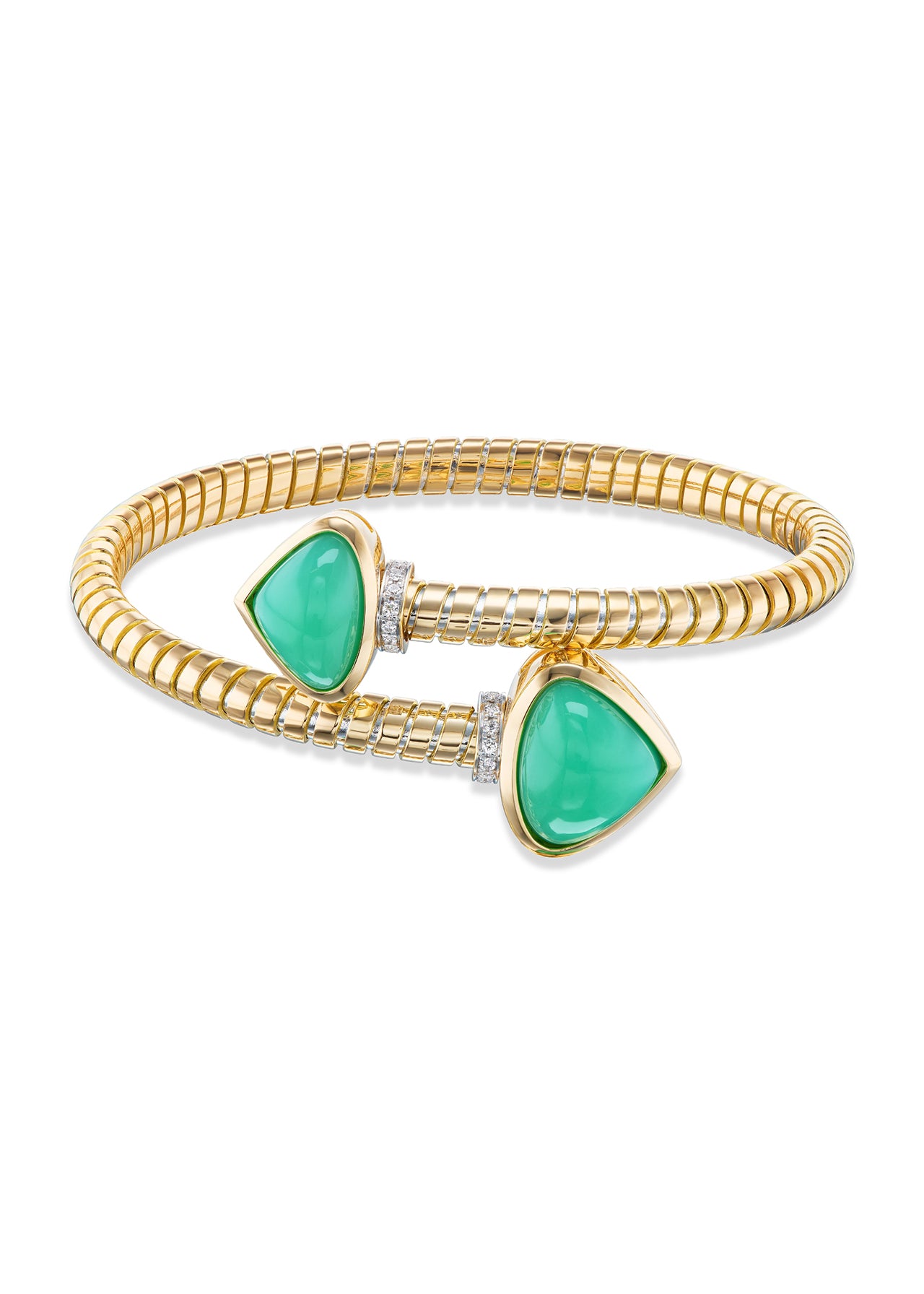 The Trisolina Chrysoprase Bypass Bracelet features 3.69cts of vivid green chrysoprase and 0.18cts of pavé diamonds, set in 18K yellow gold for bold yet timeless sophistication.