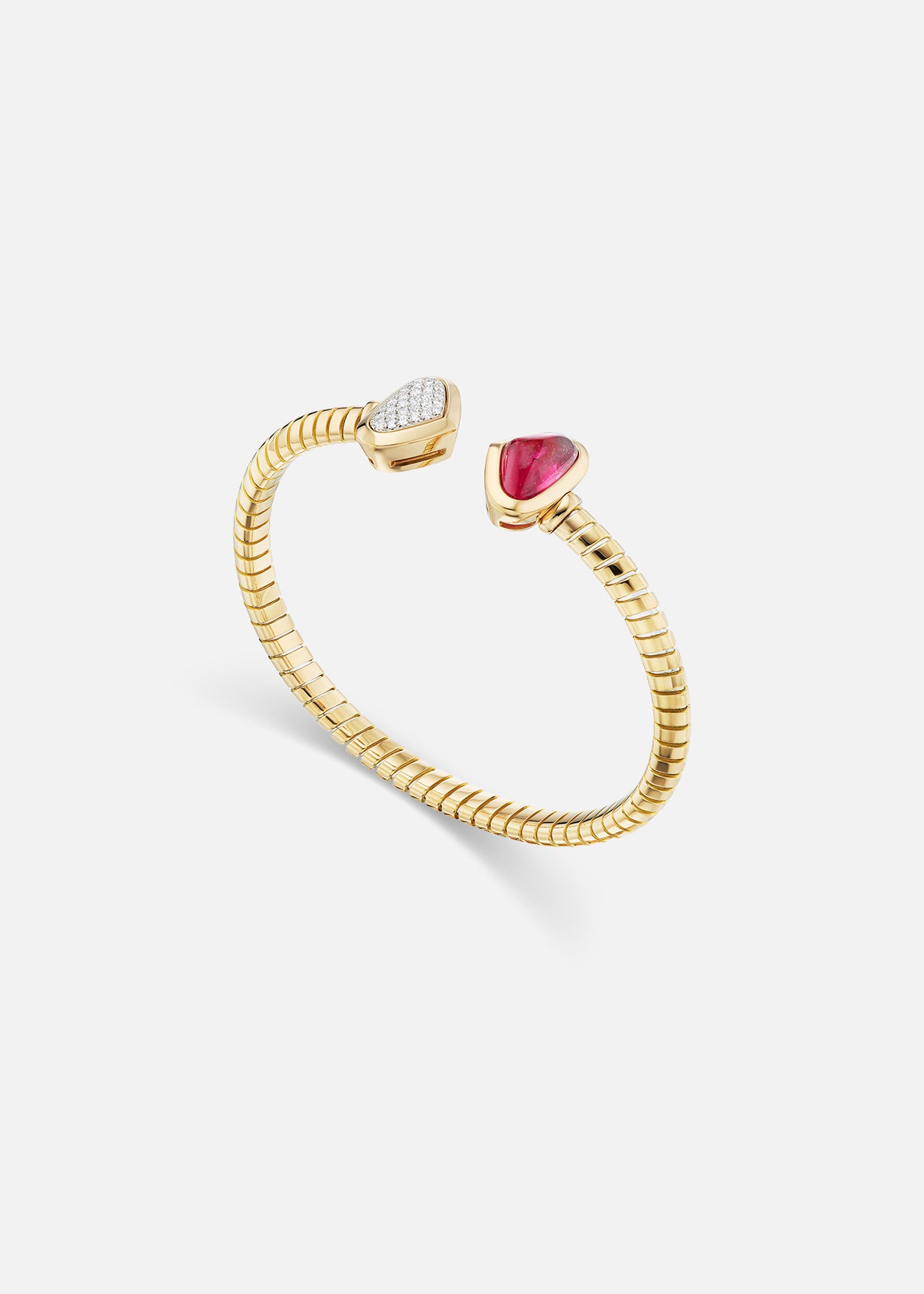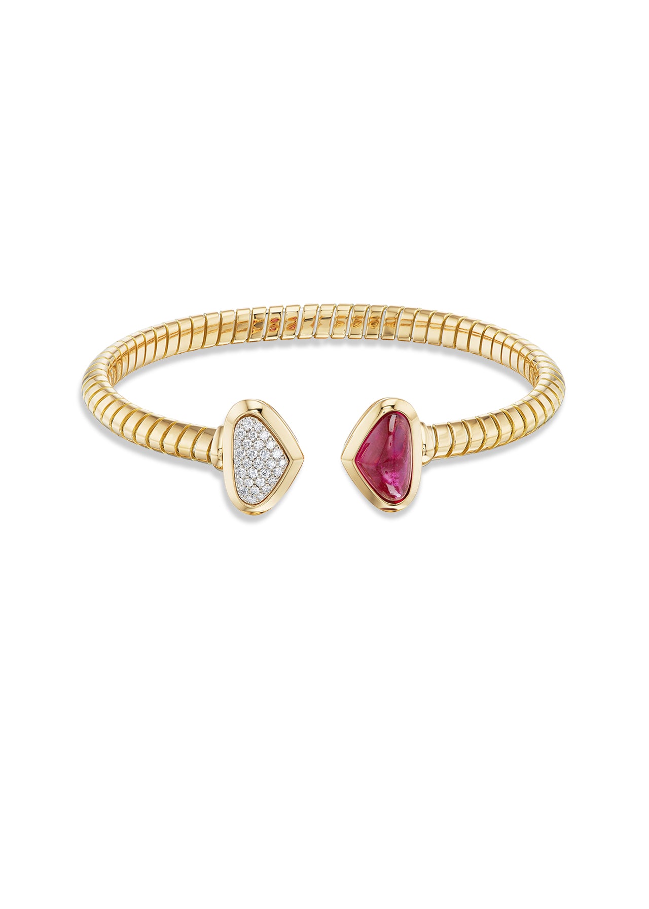 Rich rubellite meets refined sparkle in the Trisolina Castagna Bangle. Featuring a 1.50ct cabochon rubellite and 0.22cts pavé diamonds, it’s crafted in 18K yellow gold for vibrant elegance.