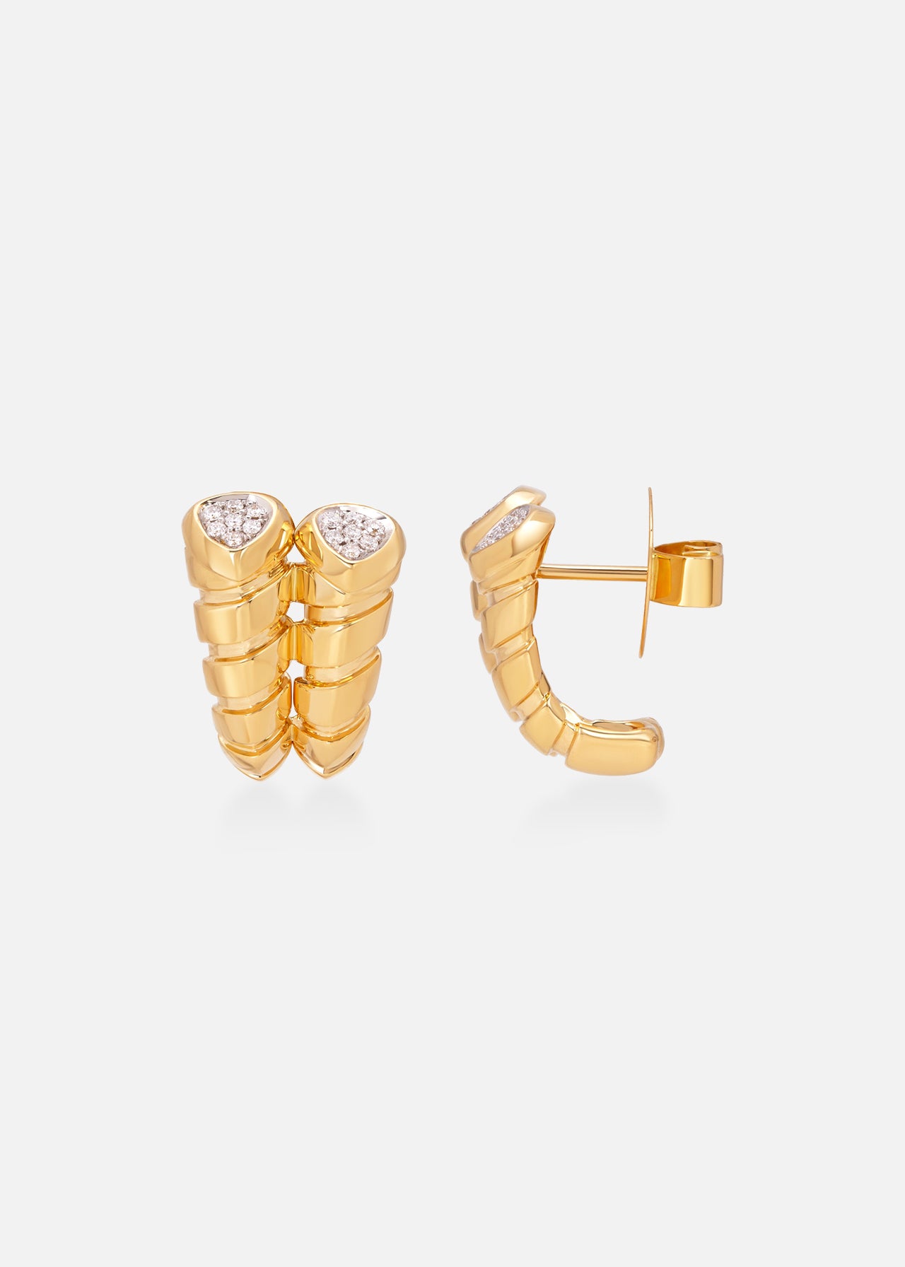 The Trisolina Double Earrings in 18K yellow gold bring modern elegance to any look. Two curved segments are accented with 0.13cts of pavé diamonds, adding a touch of sparkle that catches the light beautifully.