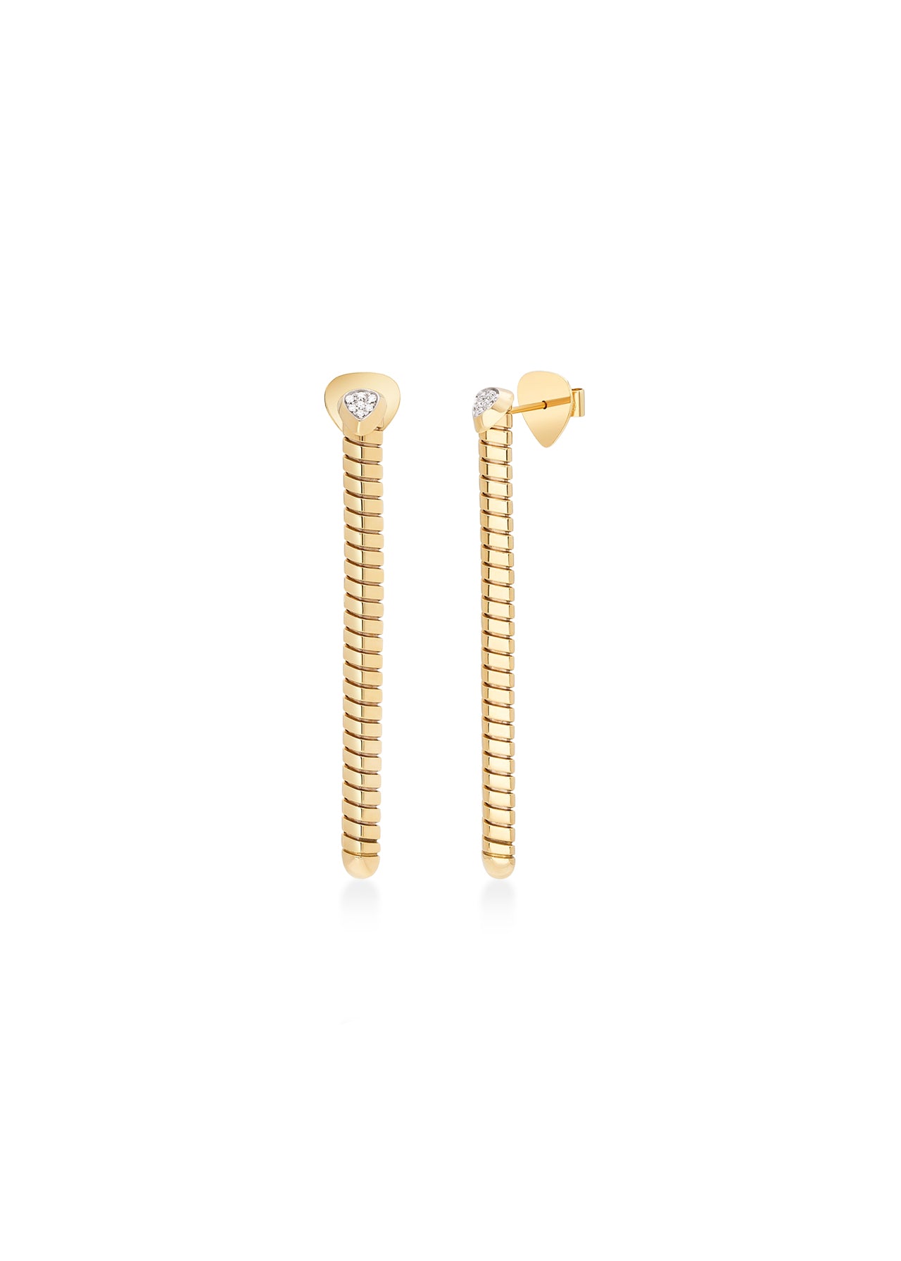 Elegant and versatile, the Trisolina Drop Earrings in 18K yellow gold feature 0.08cts of pavé diamonds for a refined sparkle. Their slender form lends timeless sophistication to any ensemble.