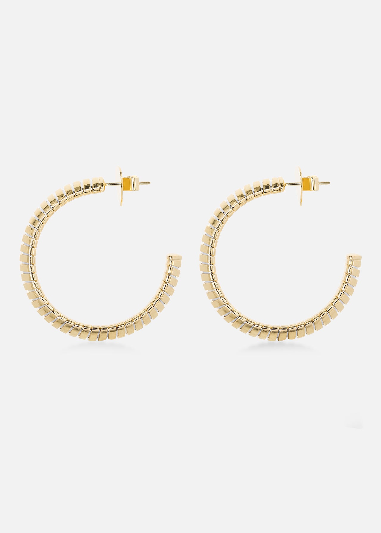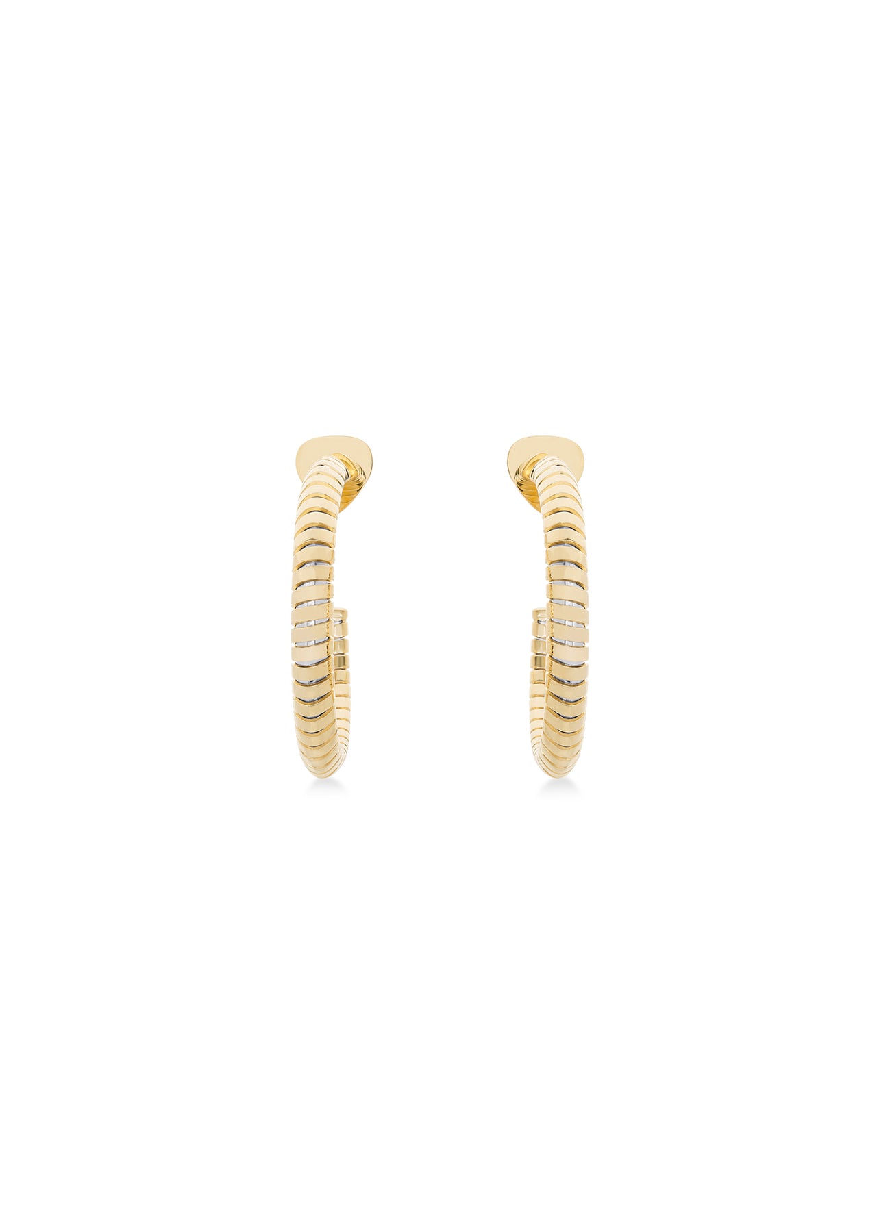 Sleek and sculptural, the Trisolina Hoop Earrings in 18K yellow gold feature the collection’s signature textured finish. At 45mm, they make a bold yet timeless statement for everyday or evening wear.