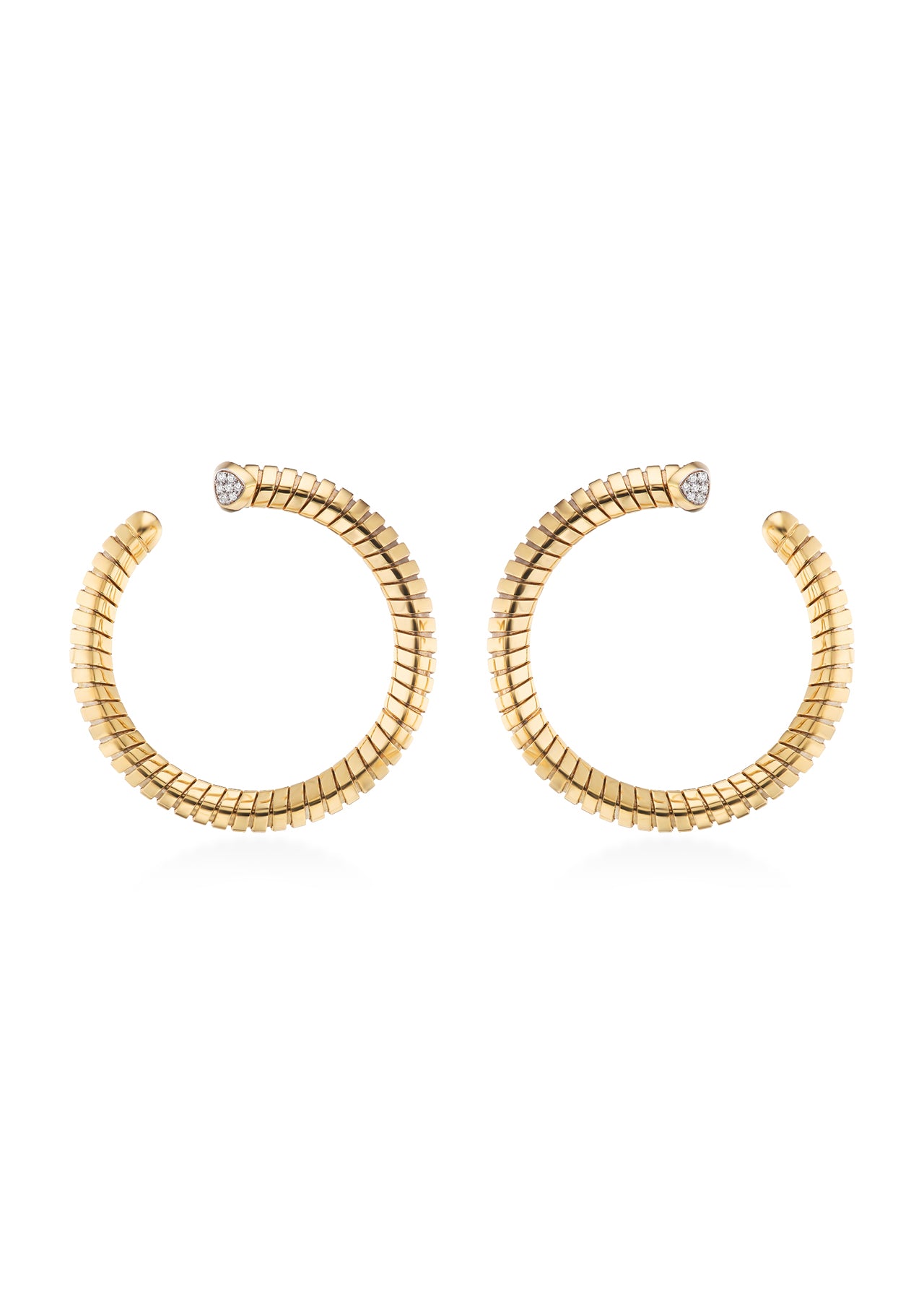 A contemporary twist on a timeless silhouette, the Trisolina Hoops in 18K yellow gold feature 0.08cts of pavé diamonds, adding refined sparkle to their bold, sculptural form.