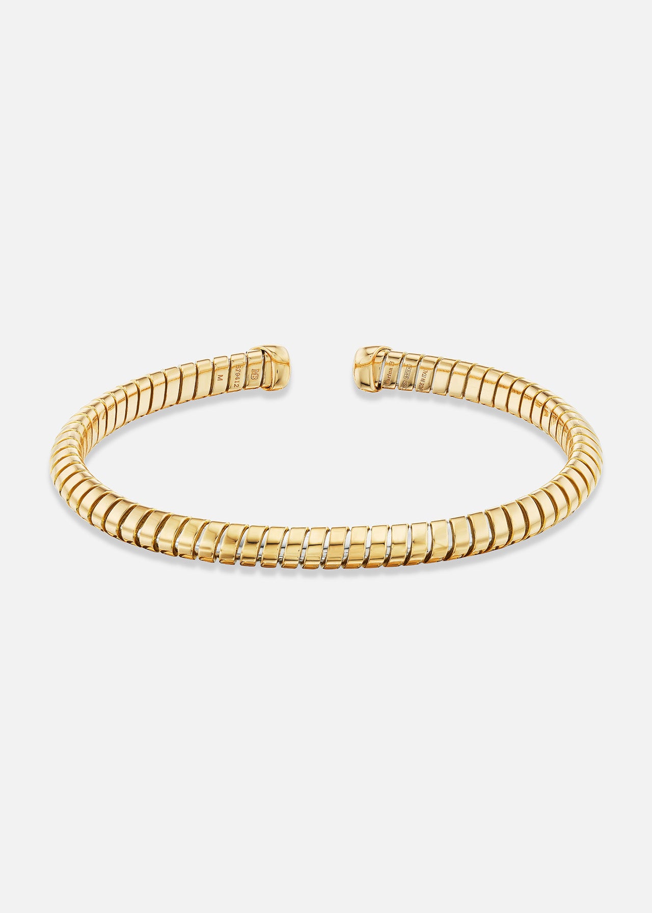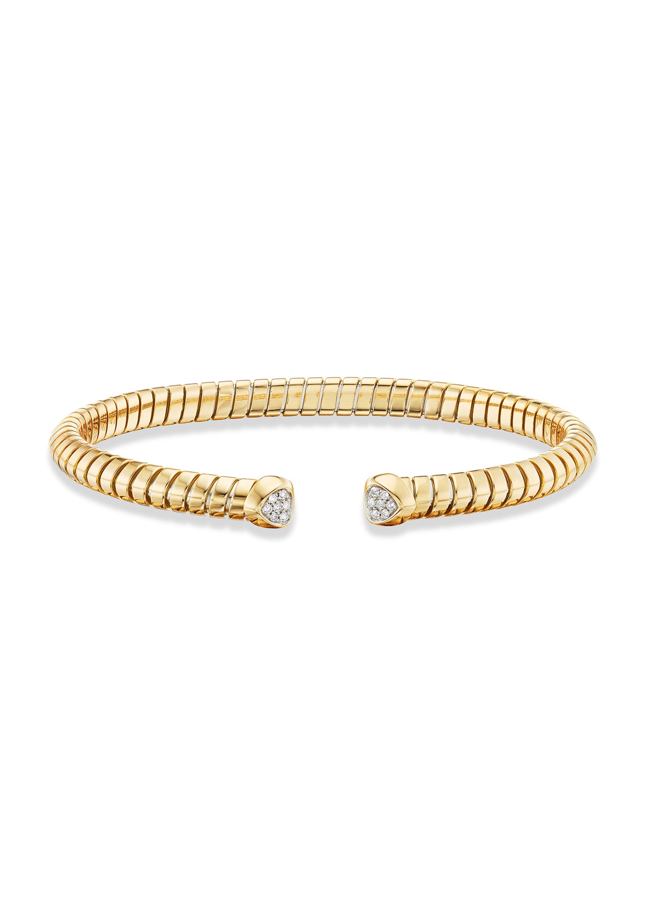 The Trisolina Open Bangle in 18K yellow gold features 0.08cts of pavé diamonds on polished end caps. A flexible design offers timeless elegance with modern comfort.
