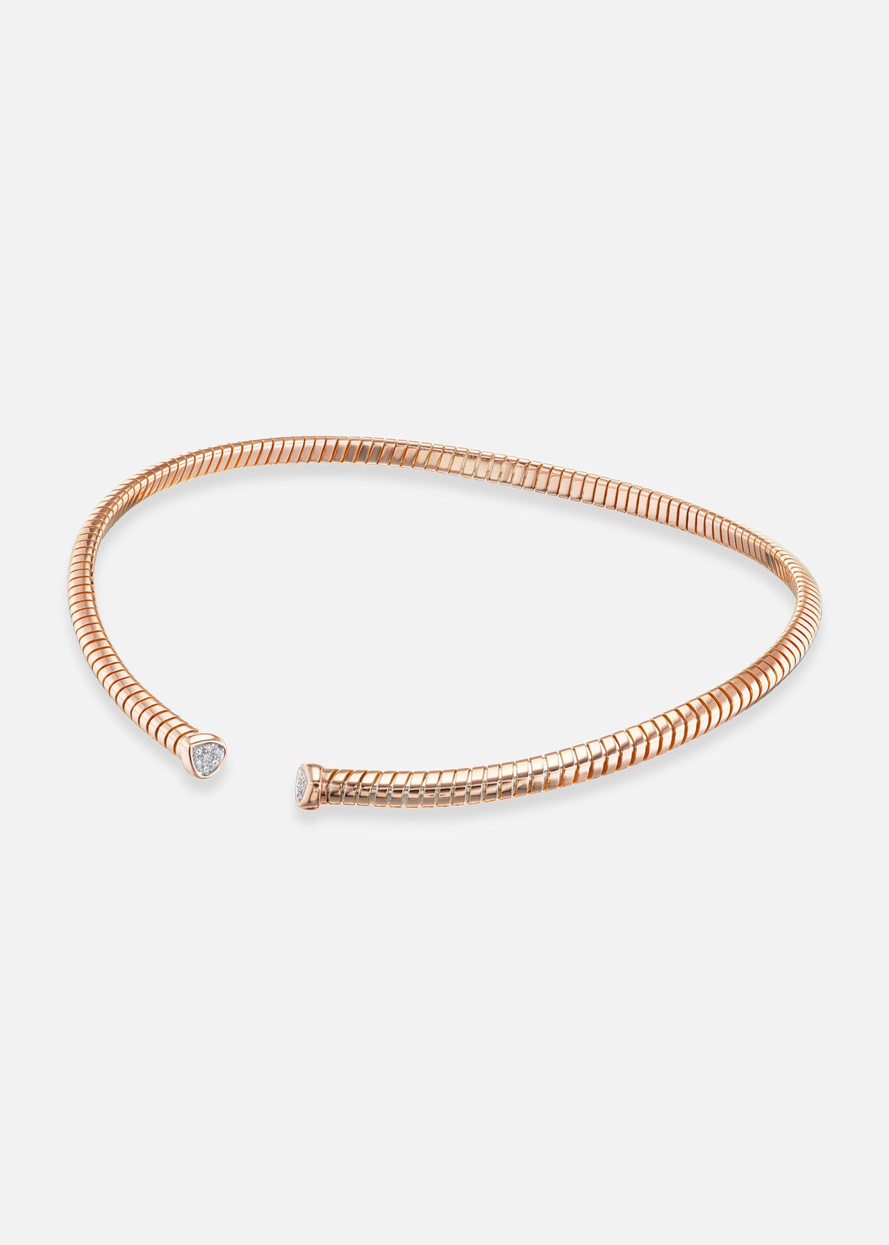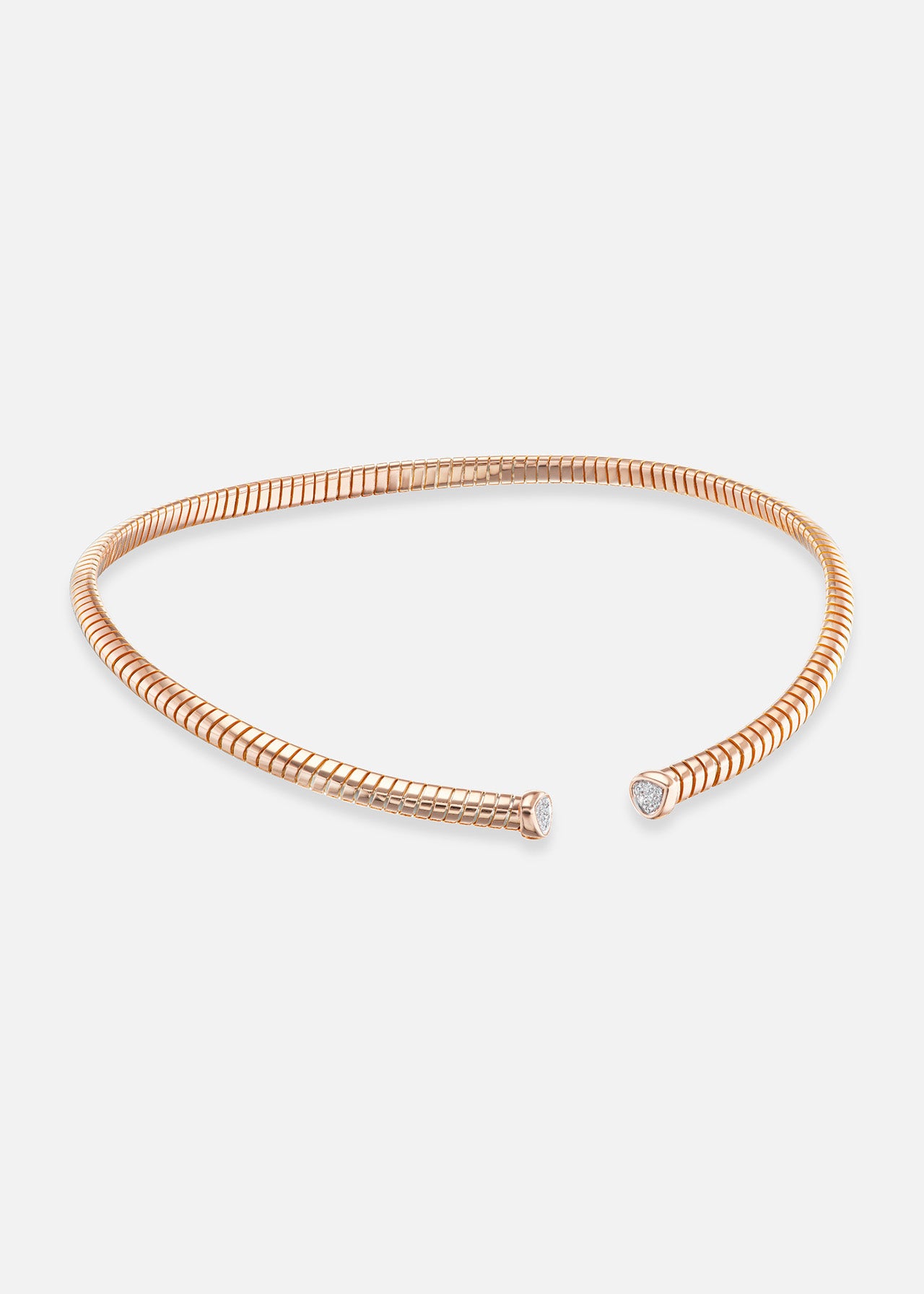 Refined and feminine, the Trisolina Collar in 18K rose gold features 0.13cts of pavé diamonds for a soft shimmer. Its flexible silhouette curves elegantly around the neckline.