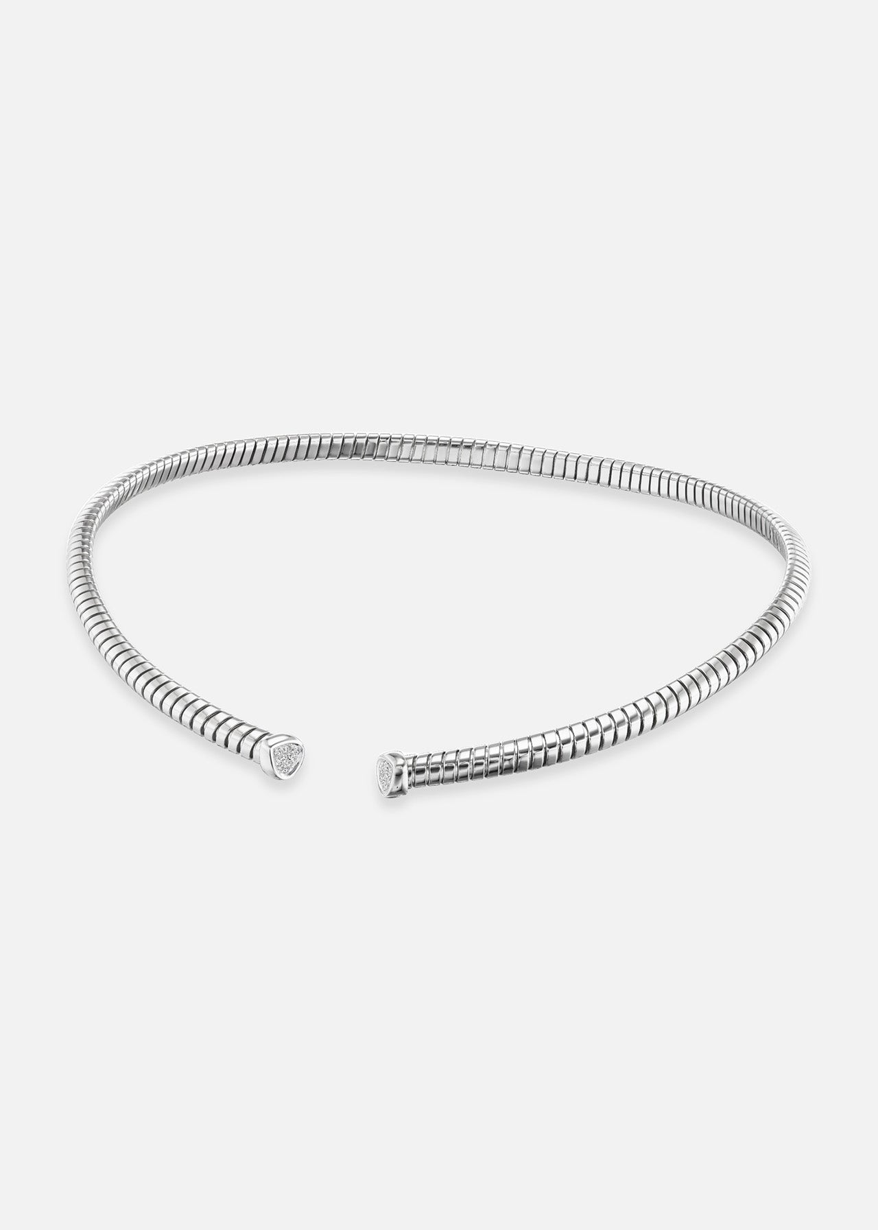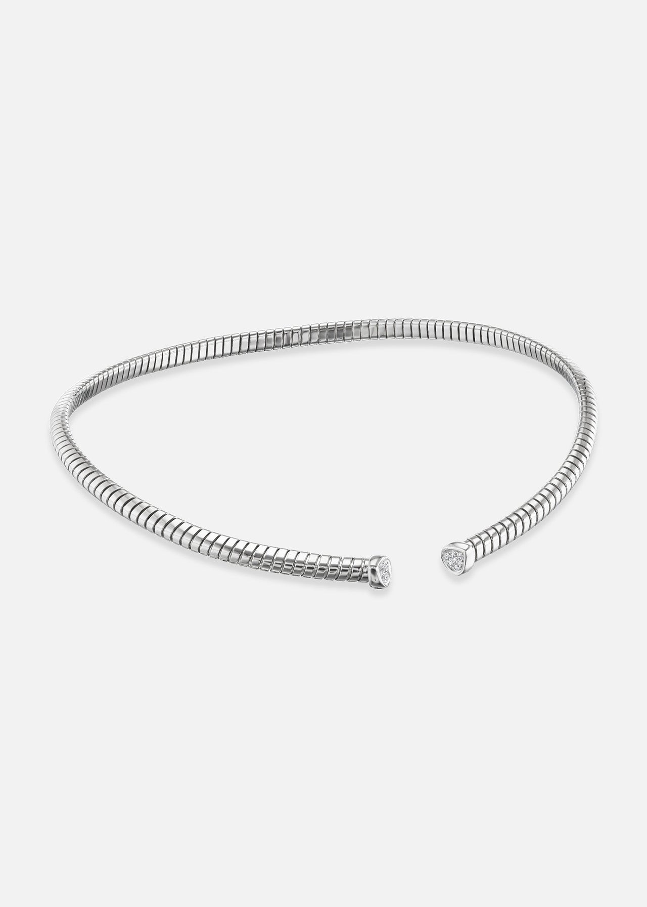 Minimalist and luminous, the Trisolina Collar in 18K white gold features 0.13cts of pavé diamonds for refined sparkle. A sleek, flexible design ideal for everyday elegance.