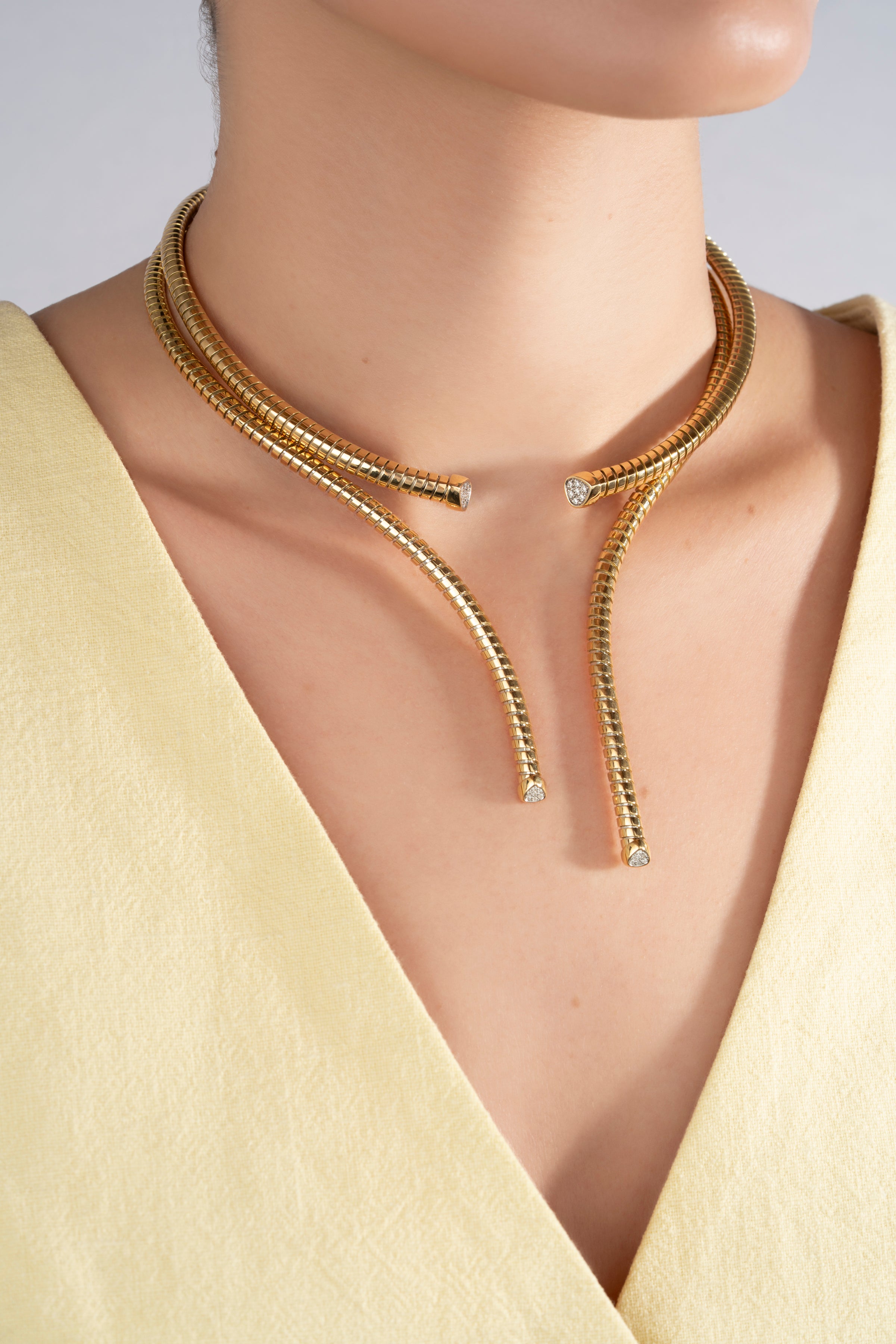 Sleek and refined, the Trisolina Collar in 18K yellow gold adds subtle brilliance with 0.08cts of pavé diamonds. A graceful silhouette perfect for layering or understated solo wear.