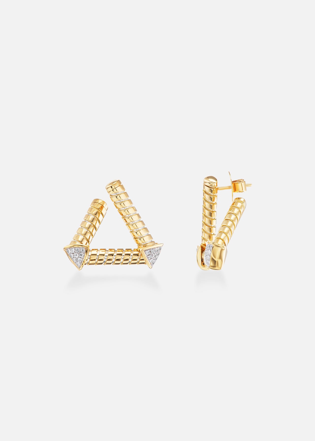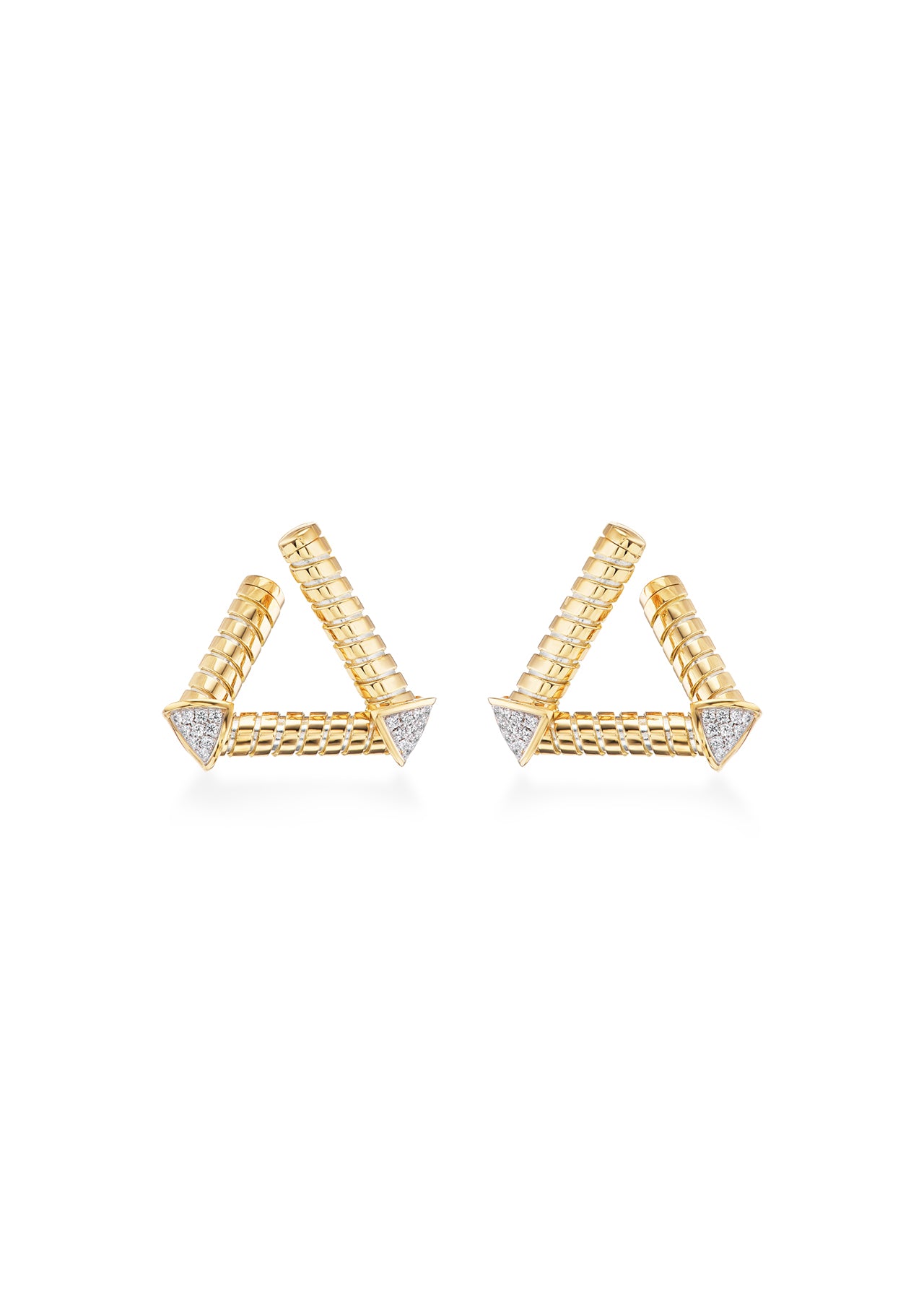 Bold geometry meets refined elegance in these Trisolina Traliccio earrings. Crafted in luminous 18K yellow gold, their distinctive triangular silhouette is enhanced by 0.9ct of dazzling pavé diamonds, offering a contemporary statement with timeless appeal.