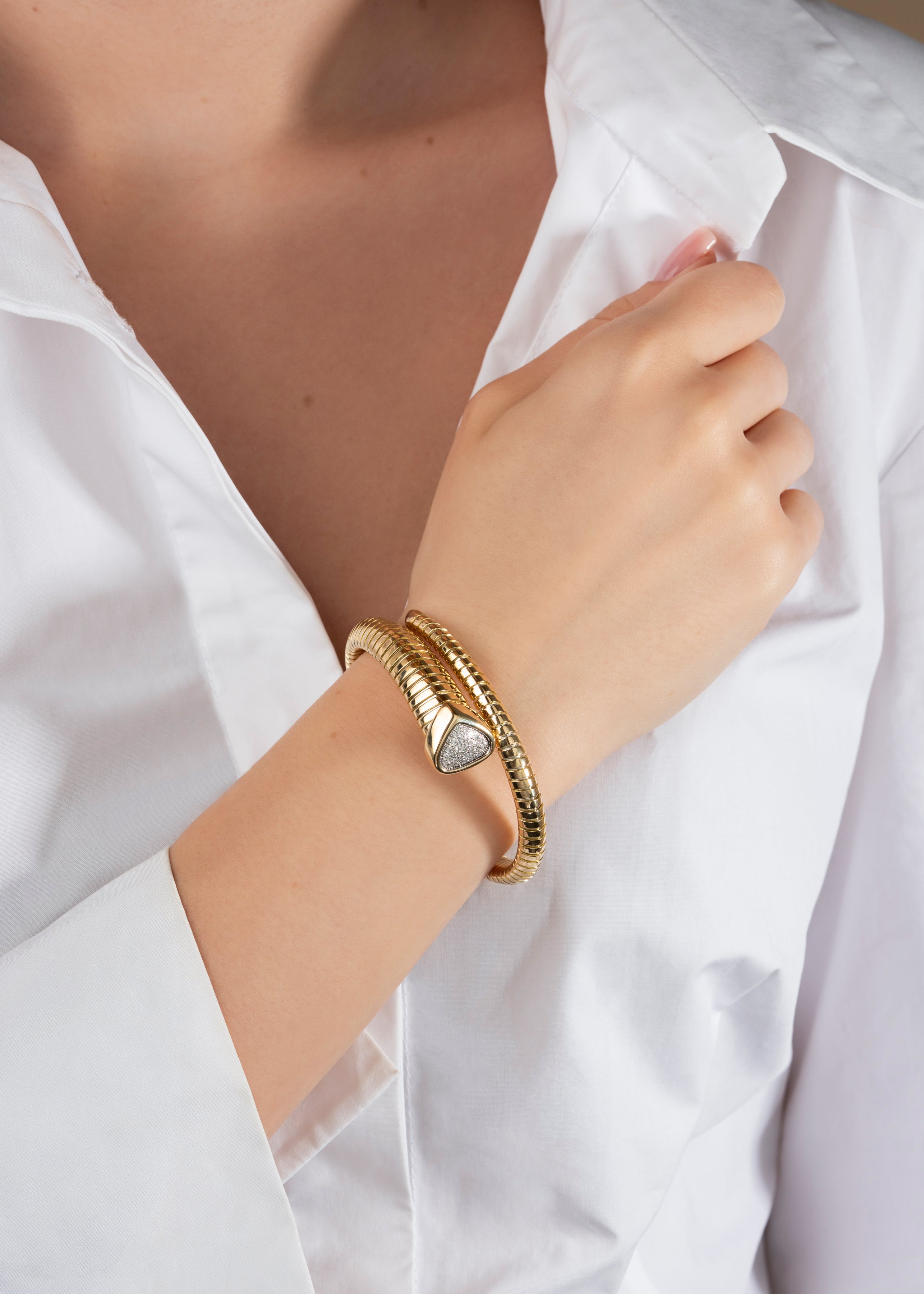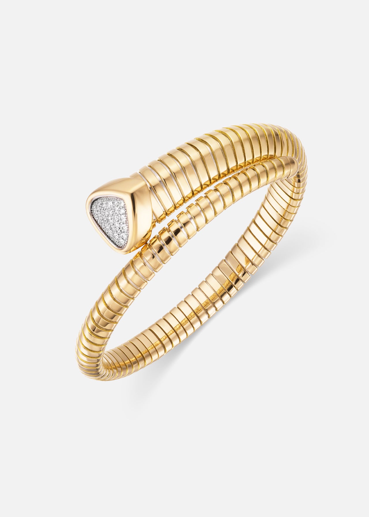 Graceful and contemporary, the Trompette Bracelet wraps around the wrist in sculpted 18K yellow gold, finished with a subtle touch of pavé diamonds totaling 0.25 cts. Sleek and expressive.